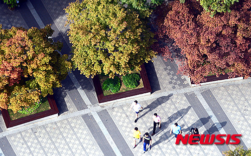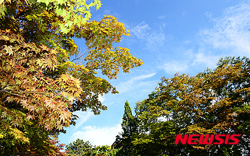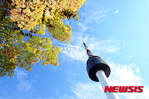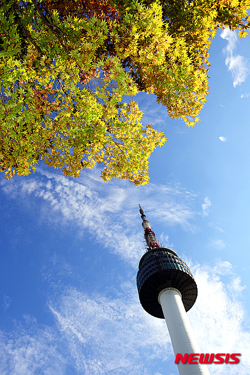 ソウル市竜山区のNソウルタワーの前庭では16日午後、もみじが赤や黄色に色づき始めていた。