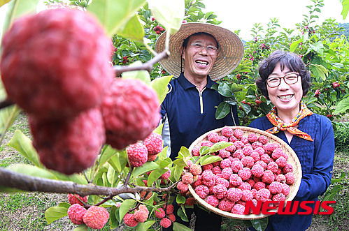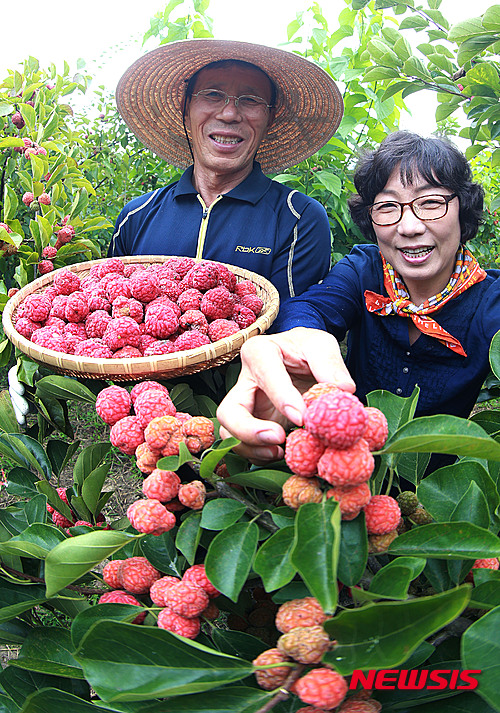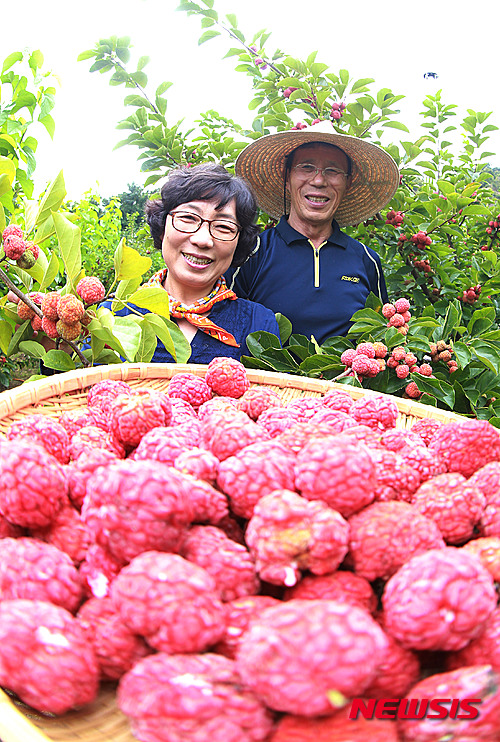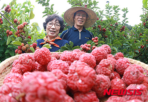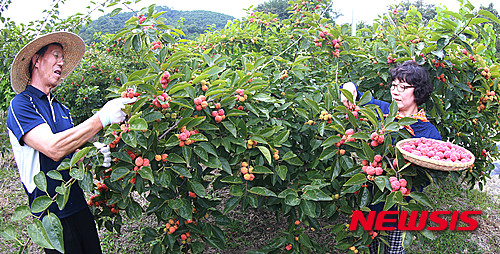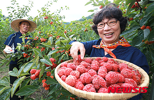 慶尚南道咸陽郡のハリグワ畑で17日、キム・チョルスさん夫妻が真っ赤に実ったハリグワの実を収穫した。