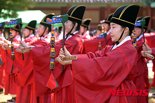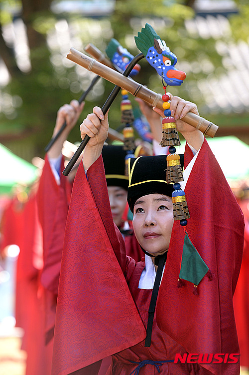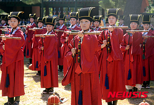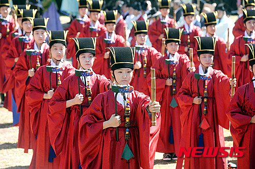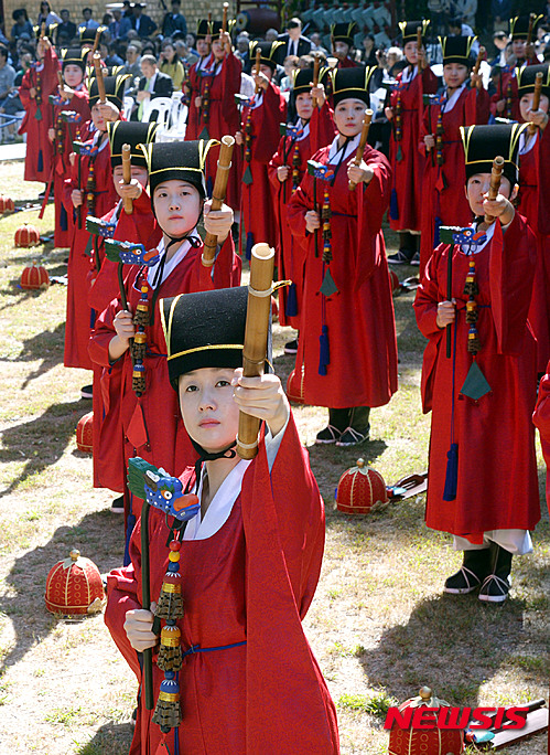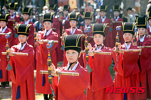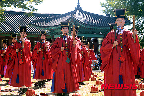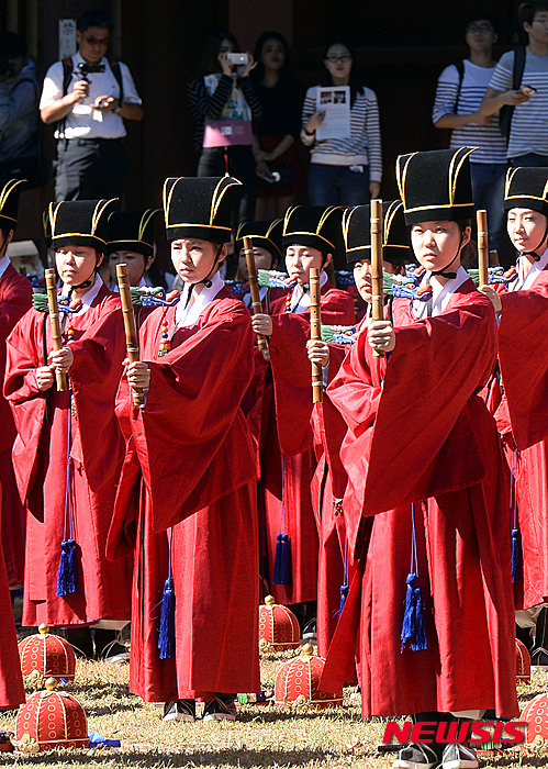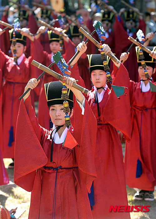 ソウル市鍾路区の成均館大学にある文廟大成殿で18日午前、秋期釈奠大祭が行われ、参加した社団法人イル舞保存会のメンバーたちが、「パルイル舞」を披露した。