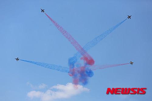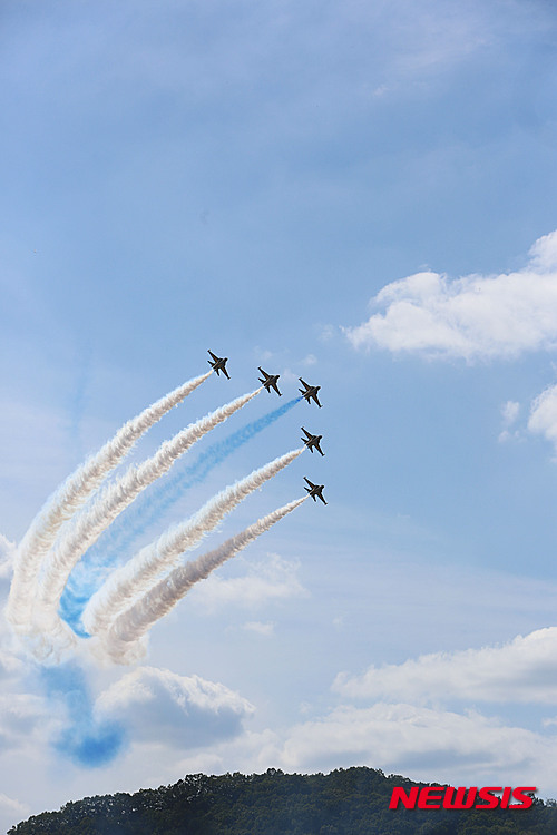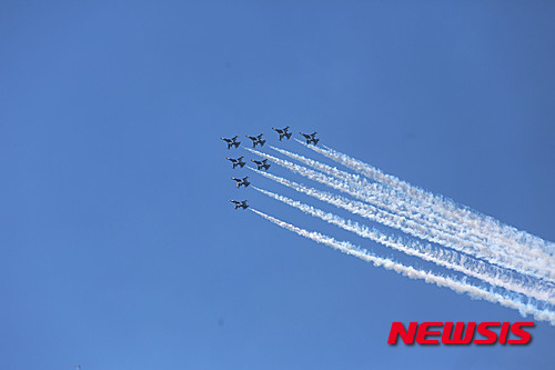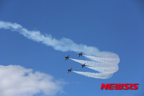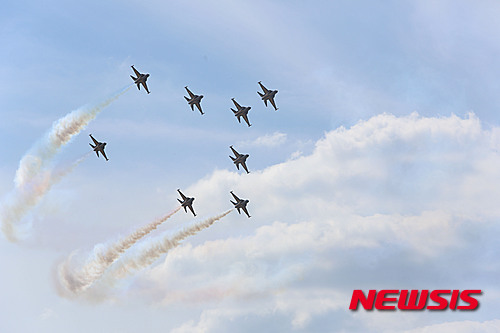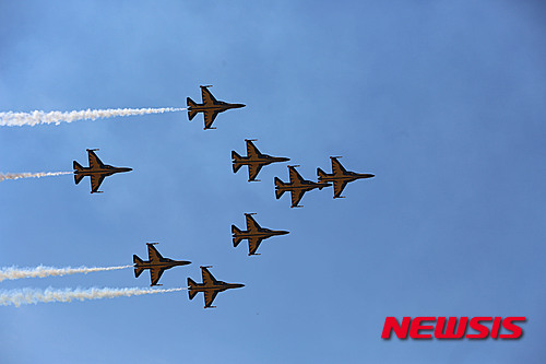 国会国防委員たちが第8戦闘航空団の現場点検を行った18日午後、韓国空軍の特殊飛行チーム「ブラックイーグルス」が見事な編隊飛行を見せた。