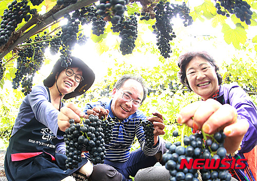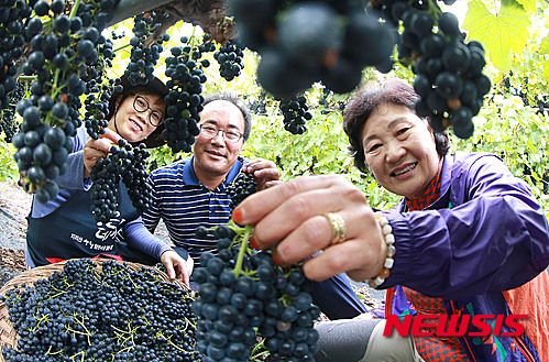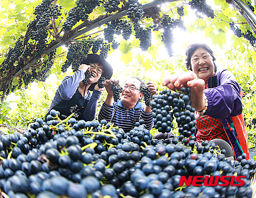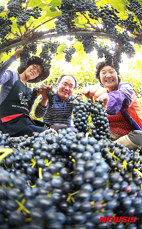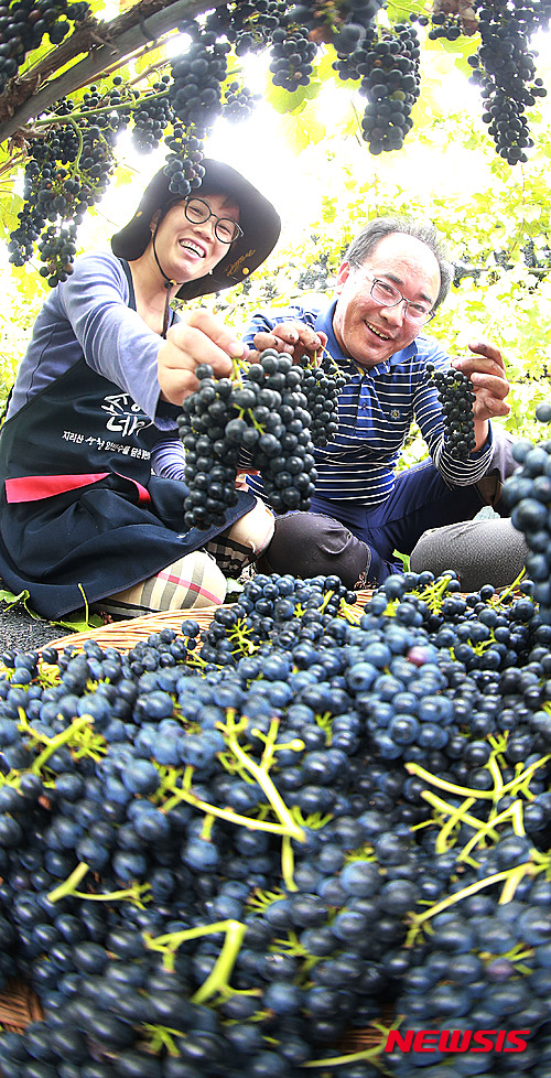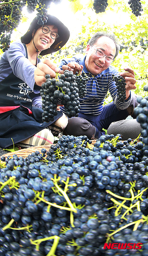 昼と夜の長さが同じになる「秋分」を控えた21日、南徳裕山のふもとにある慶尚南道咸陽郡のヤマブドウ農園では、パク・チョンジンさん夫妻が見事に実ったヤマブドウを収穫していた。