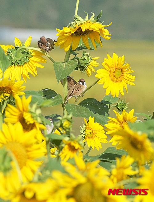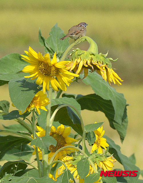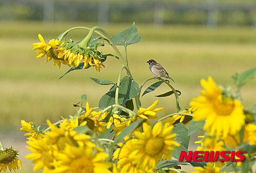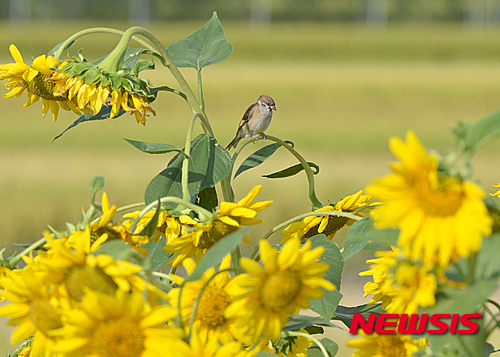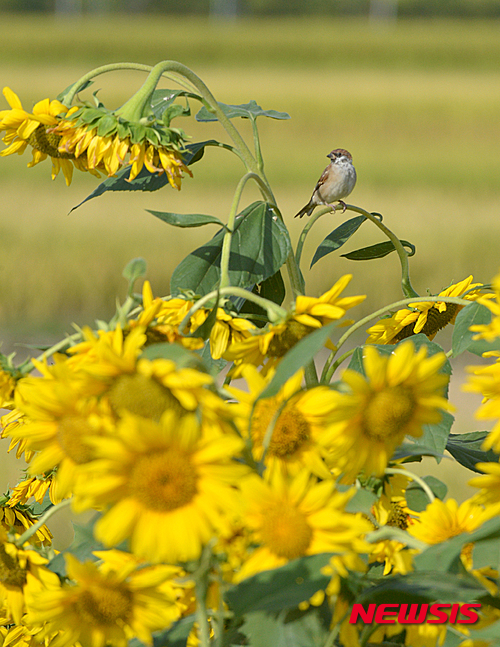 昼と夜の長さが同じになる「秋分」を翌日に控えた22日午前、慶尚南道南海郡の野原では、スズメがヒマワリにとまり、休んでいた。