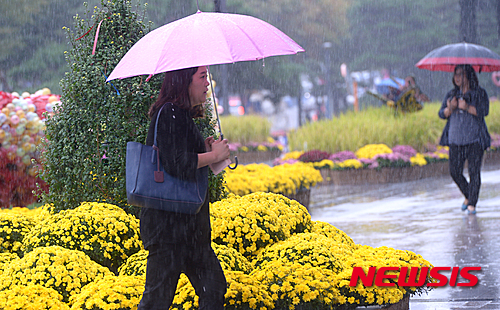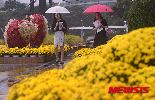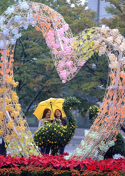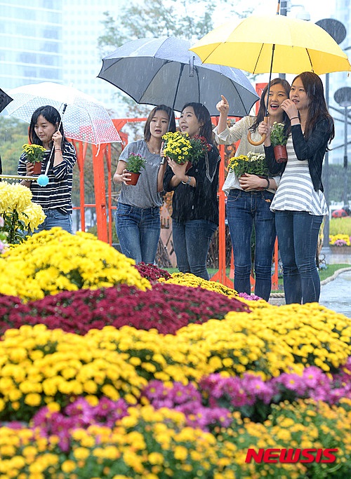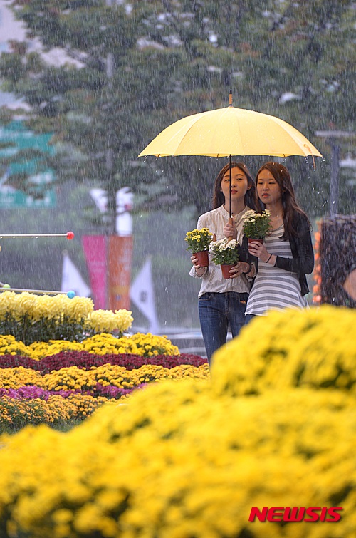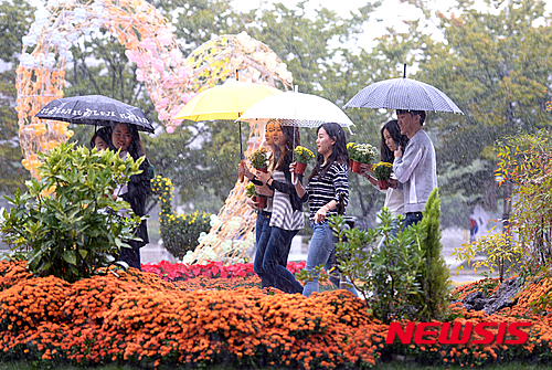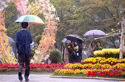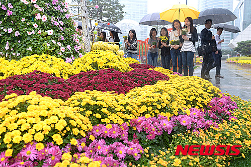 秋雨が降る中、ソウル市江南区のCOEXで1日、第15回貿易センター菊まつりが行われ、市民たちが傘を手に菊の花を鑑賞していた。