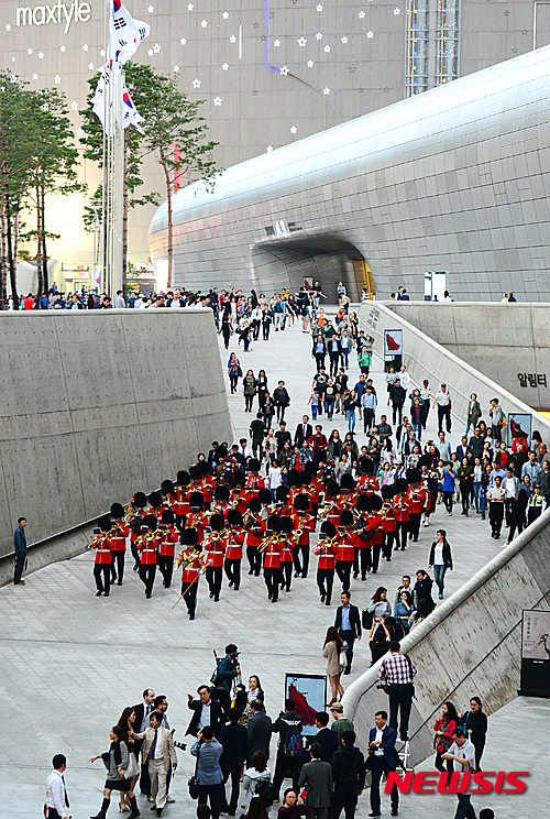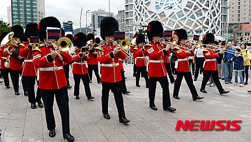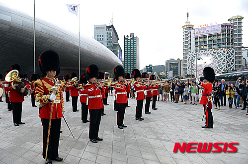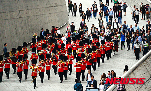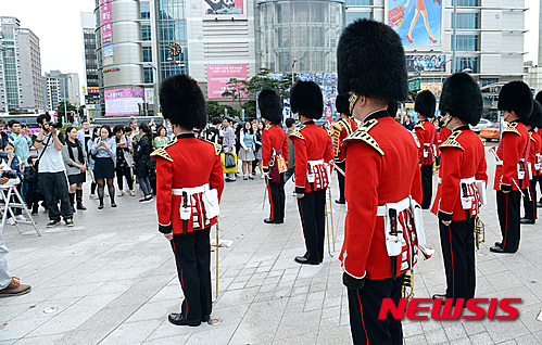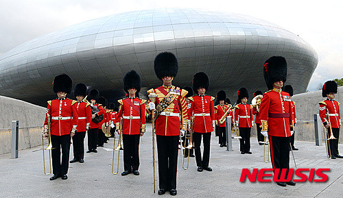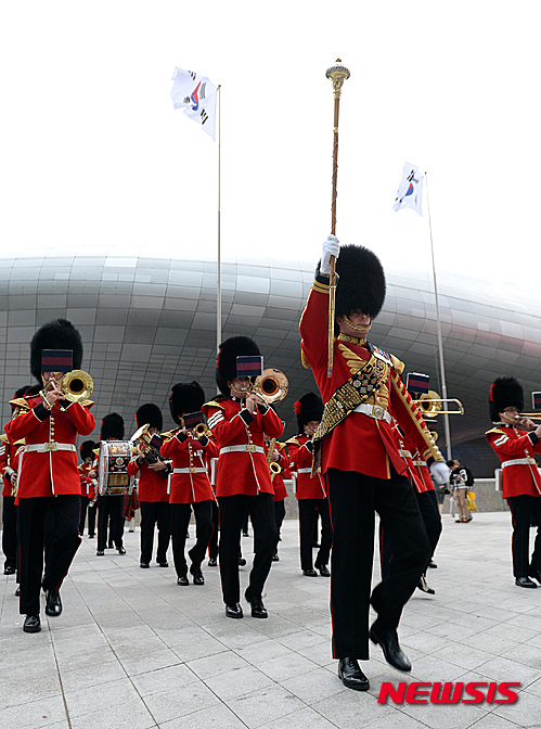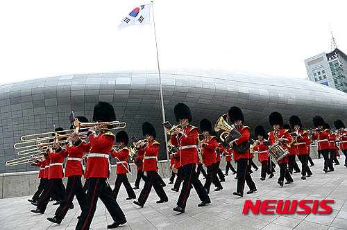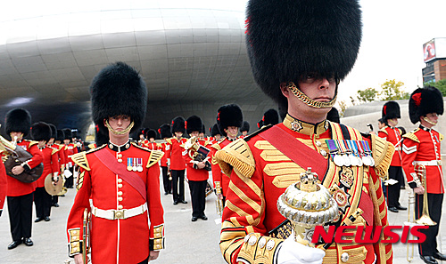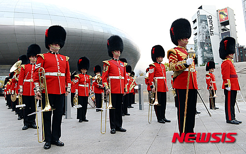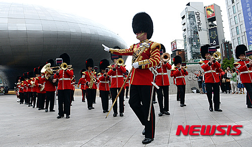 初めて韓国を訪問した英国近衛兵コールドストリーム連隊軍楽隊が1日午後、ソウル市東大門区の東大門デザインプラザで見事なパレードを繰り広げた。