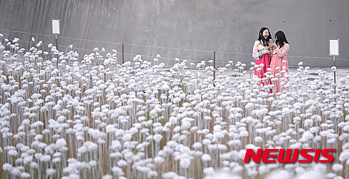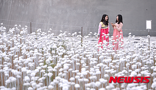 全国的に秋の訪れを感じさせる天気となった2日午後、ソウル市内の東大門デザインプラザ(DDP)を訪れ、人工の花畑に立つ中学生たち。