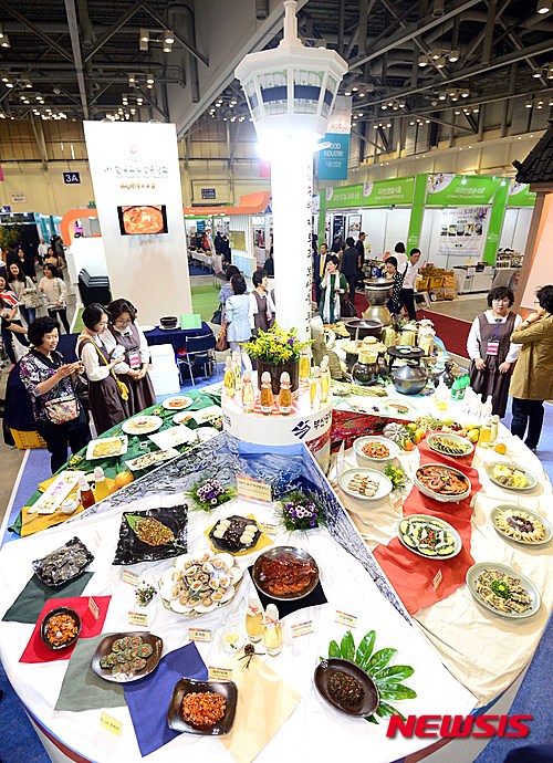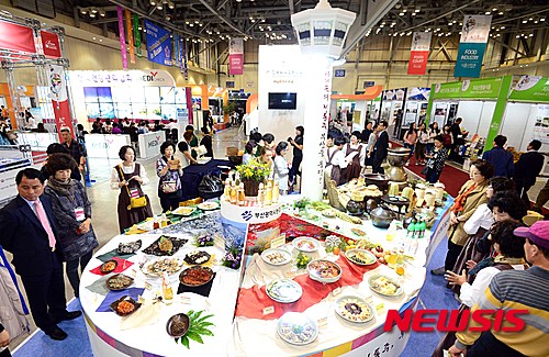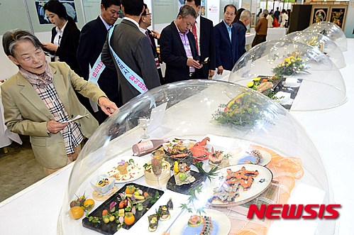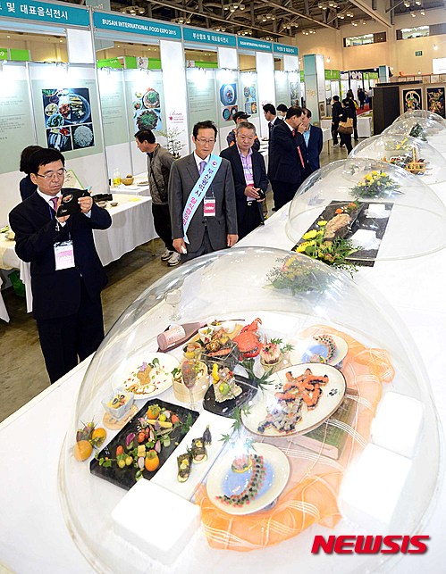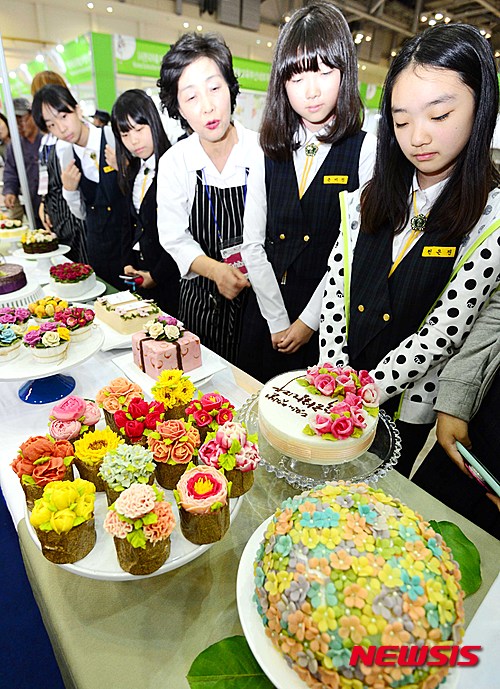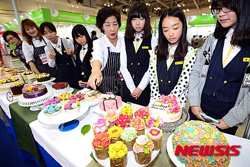 釜山展示コンベンションセンター(BEXCO)で8日午前、「釜山国際飲食博覧会2015」が開幕した。写真は、餅ケーキをはじめさまざまな展示物を見て回る来場者たち。