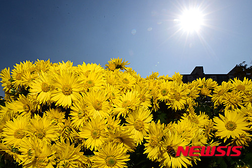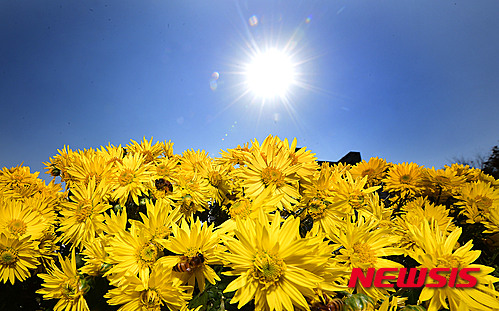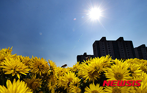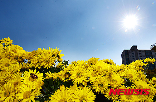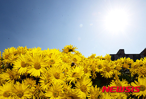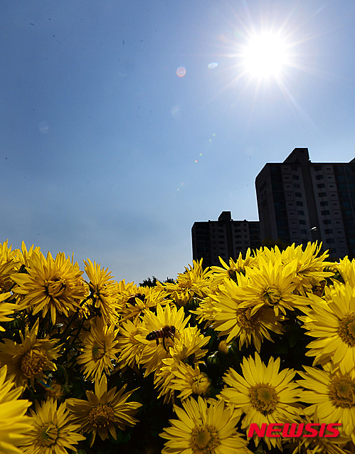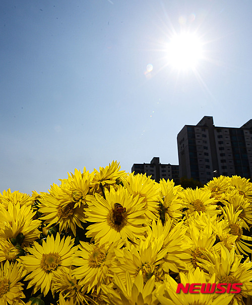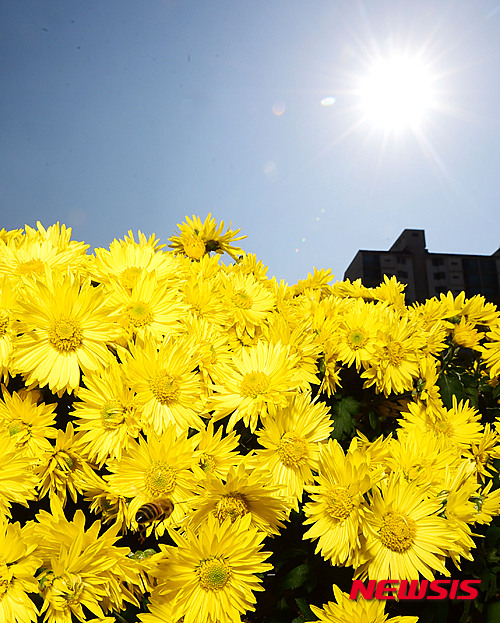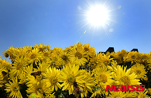 穏やかな一日となった13日午後、京畿道城南市の野塔橋付近では、ハナアブが忙しそうに菊の花の蜜を吸っていた。