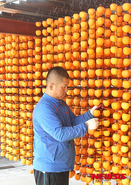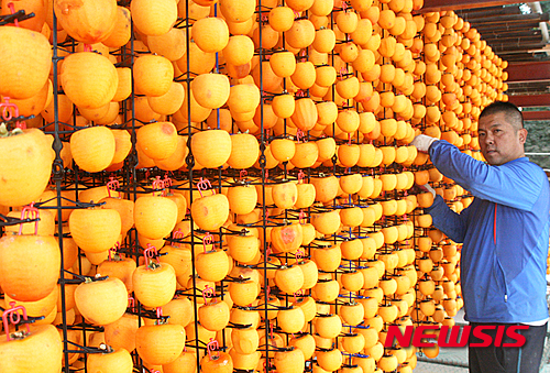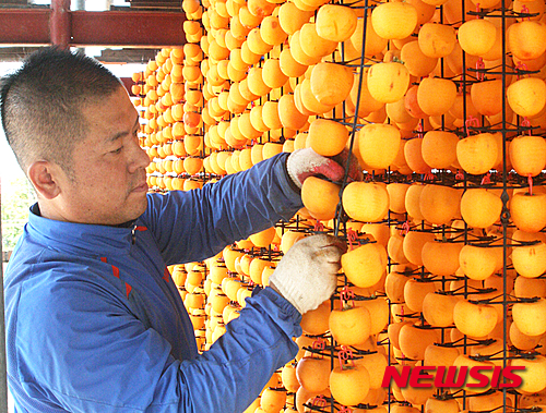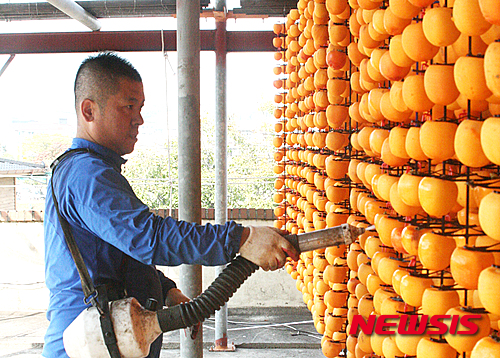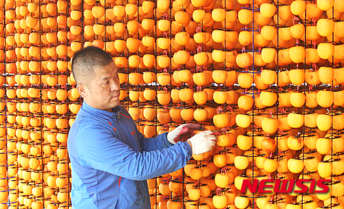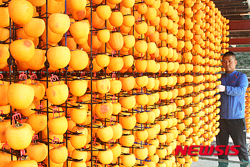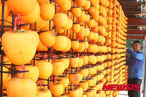 忠清北道永同郡の柿乾燥場で19日、関係者が忙しそうに柿を干していた。永同郡は干し柿の産地だ。