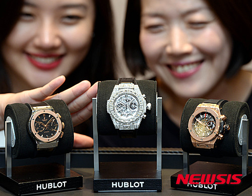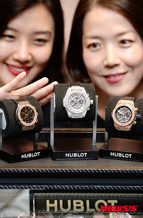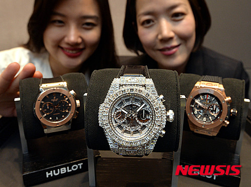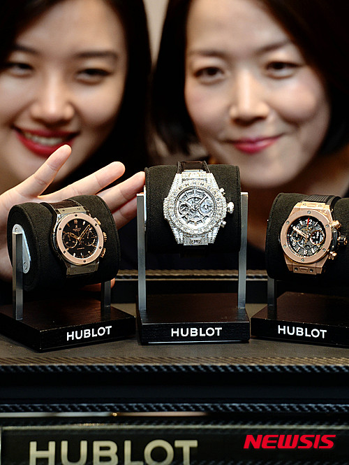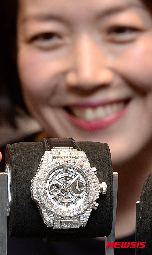 ソウル市中区のロッテ百貨店アベニュエルで20日午前、スイスの時計ブランド「HUBLOT」の代表的モデル「Big Bang」発売10周年を記念し、ダイヤモンド653個を使って制作された12億ウォン(約1億2000万円)相当の「Big Bang Unico Haute Joaillerie」を、従業員たちが披露した。