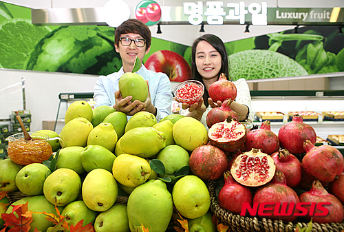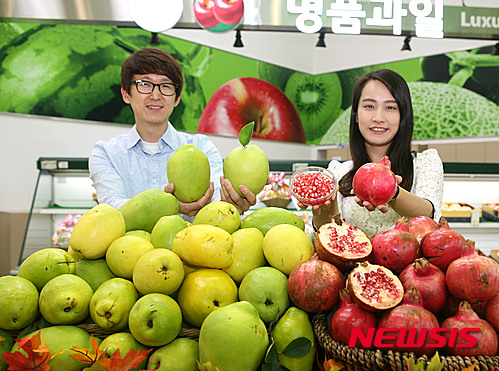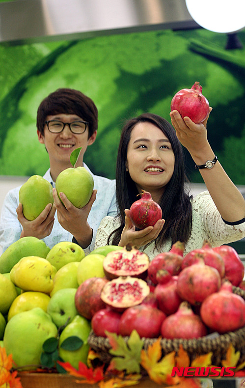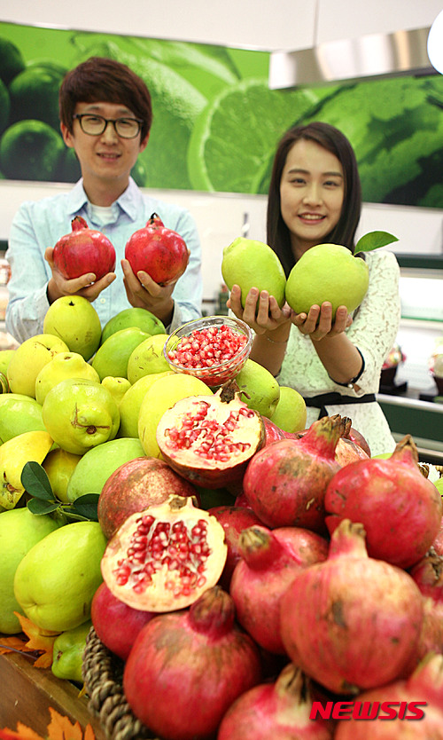 ソウル市瑞草区の農協ハナロクラブ良才店で20日、モデルたちが、季節の変わり目の風邪予防に効果的なカリンやザクロをPRした。