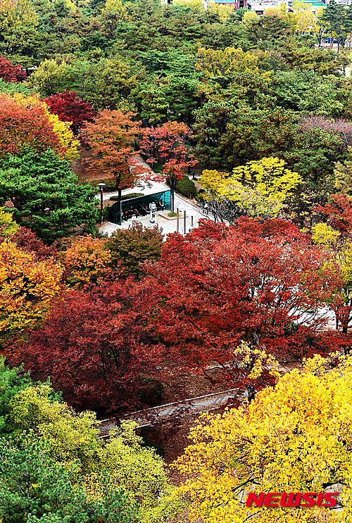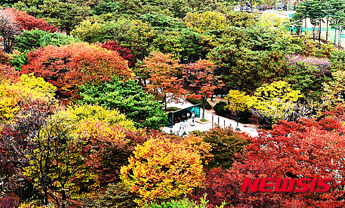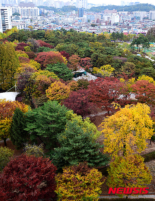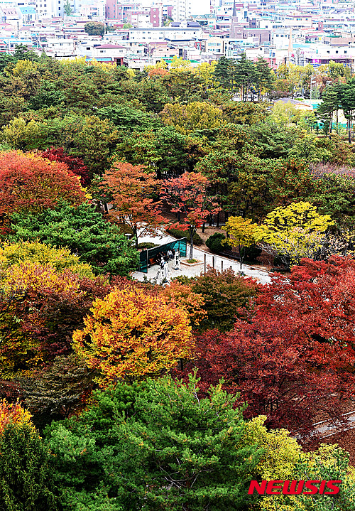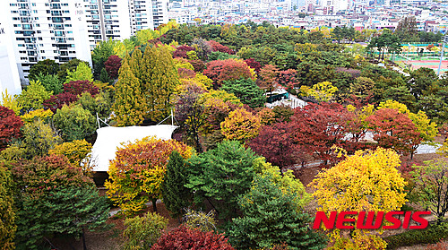 秋らしく涼しい日が続いている中、京畿道水原市内の公園では26日午後、赤や黄色に色づいた木々が市民たちの目を引いていた。
