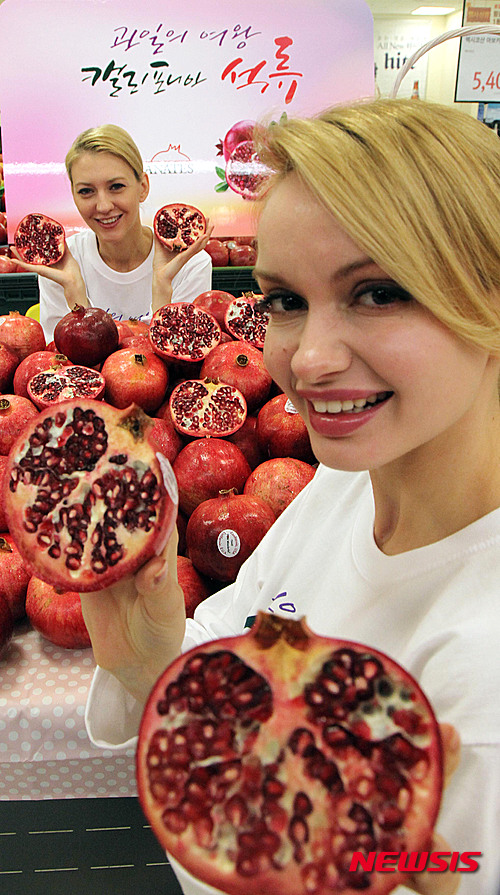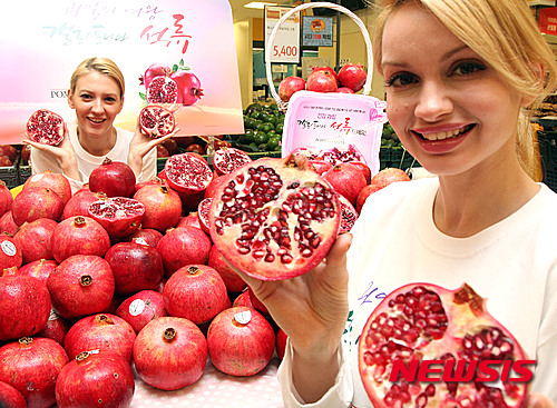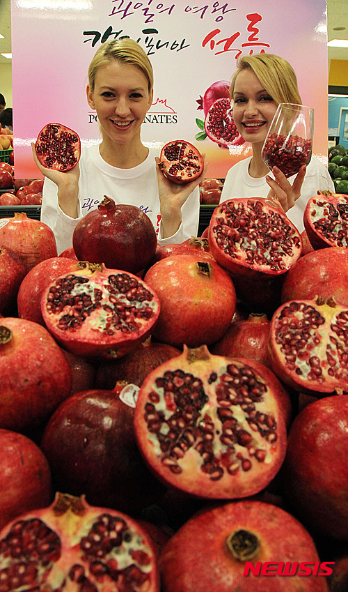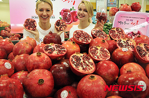 ソウル市内の大手スーパー「イーマート」竜山店で27日午前、モデルたちが米国カリフォルニア産ザクロをPRした。