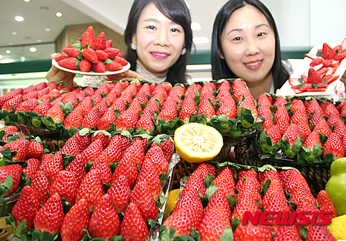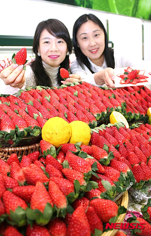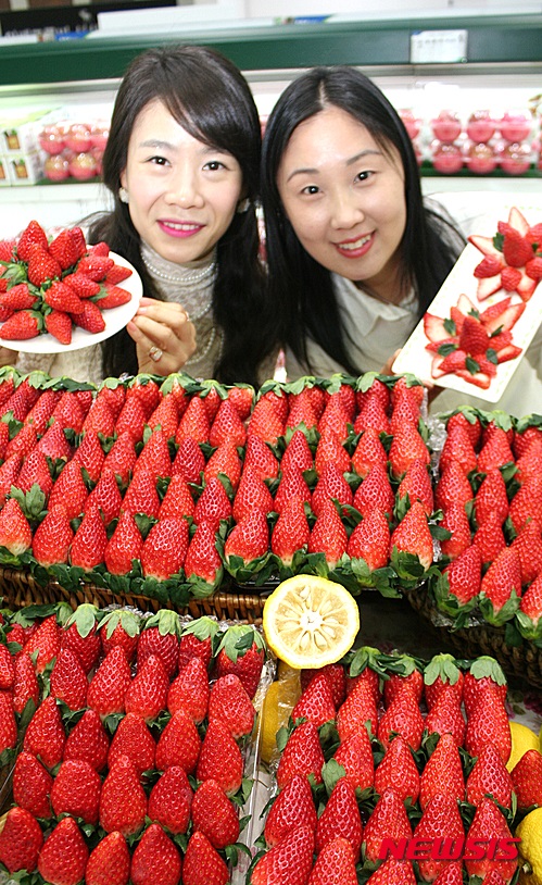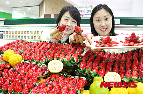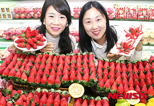 ソウル市瑞草区の農協ハナロクラブ良才店で2日、モデルたちが、初物のイチゴをPRした。