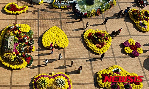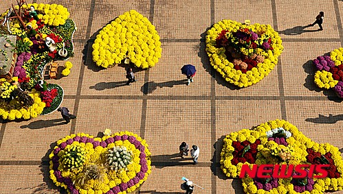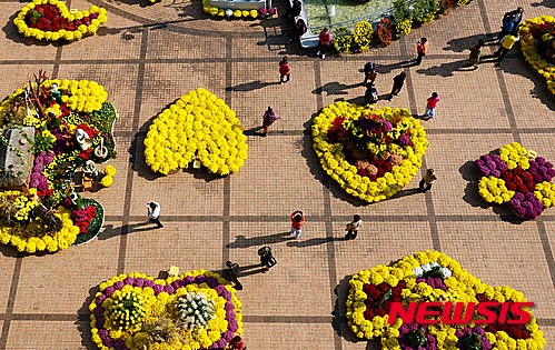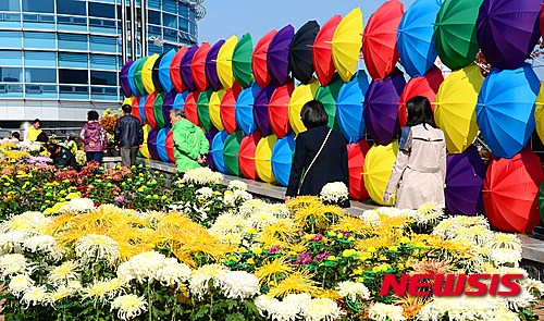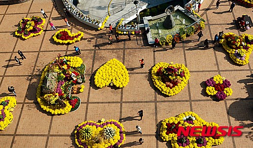 菊まつりが開催されている釜山市東区庁前広場で2日午後、市民たちがさまざまな菊の花を眺めながら楽しいひとときを過ごした。