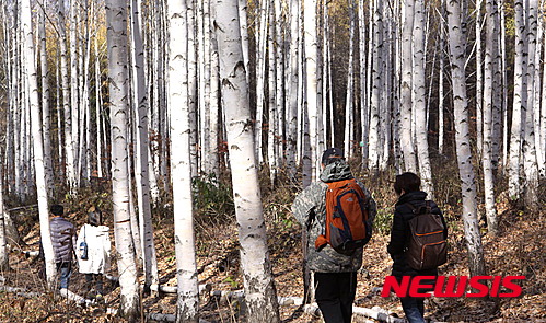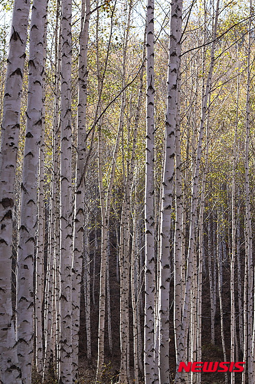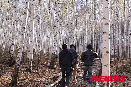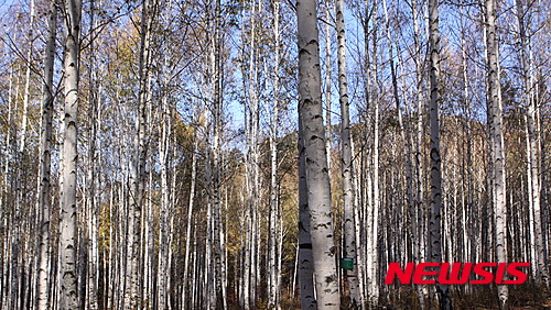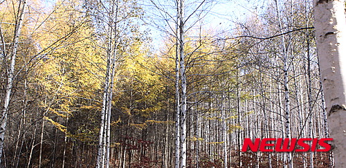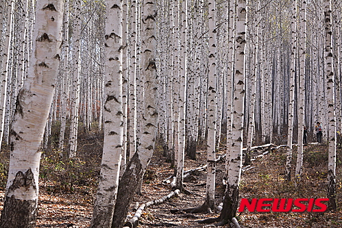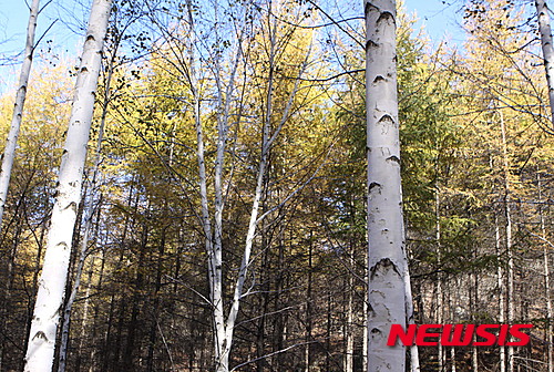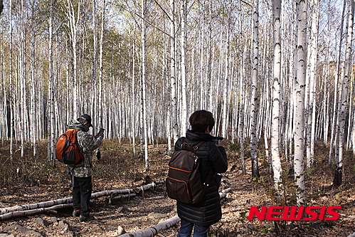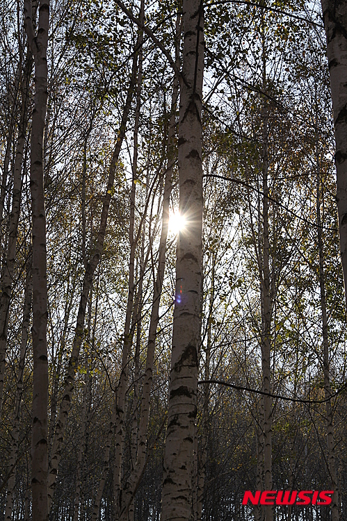 江原道麟蹄郡の白樺林を多くの人が訪れ、秋の雰囲気を満喫していた。写真は3日撮影。
