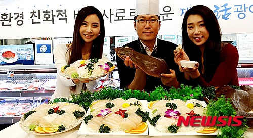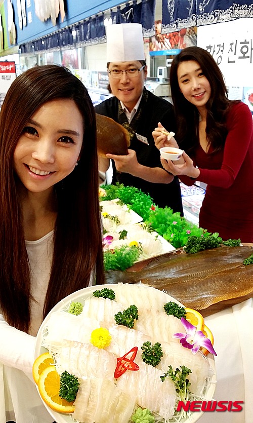 ソウル市中区の大手スーパー「ロッテマート」ソウル駅店で4日、モデルたちが、環境にやさしい配合飼料で育てた済州産ヒラメの刺し身をPRした。