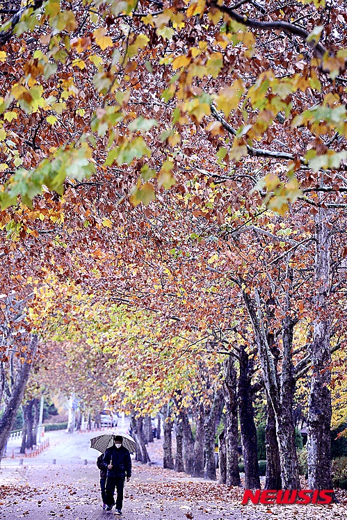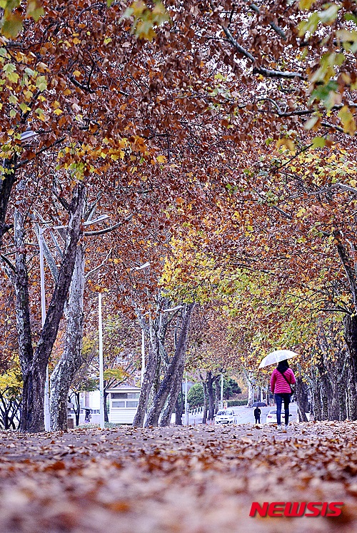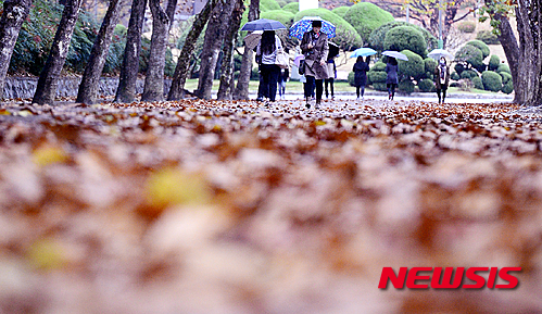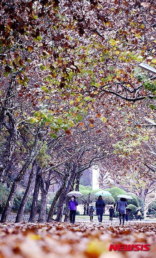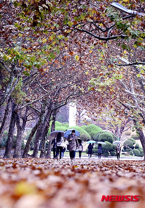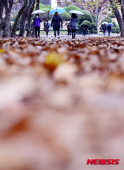 二十四節気の「小雪」を控えた18日午前、雨が降る慶北大学(大邱市北区)では、落ち葉の積もった校庭を歩く学生や学校関係者たちの姿が見られた。