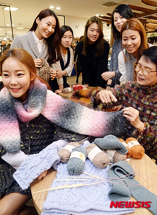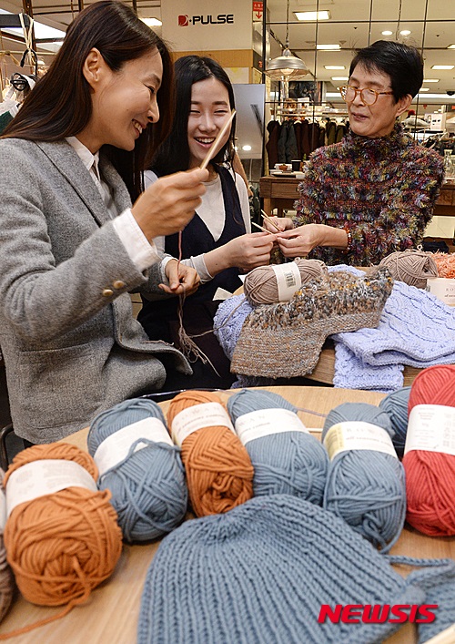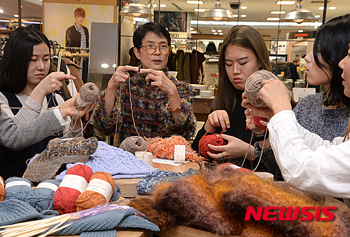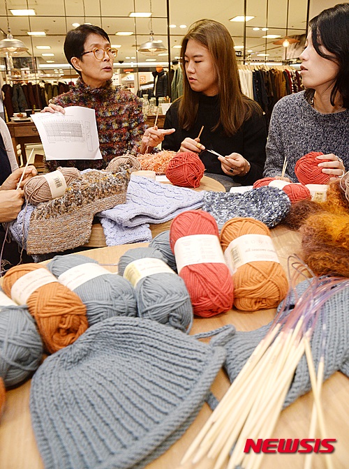 19日午前、ソウル市内の大型スーパー「ロッテマート」蚕室店で編み物教室が開かれた。写真は編み物名人キム・ギソンさん=写真右=にニットの帽子やマフラーの編み方を習う参加者たち。