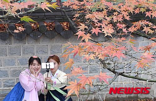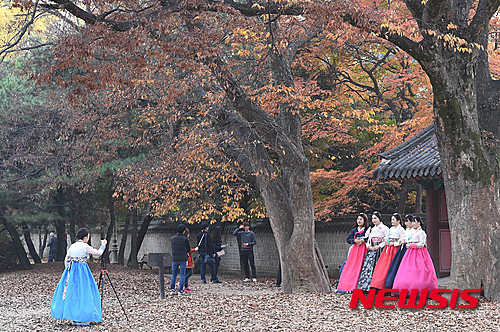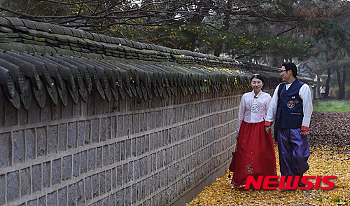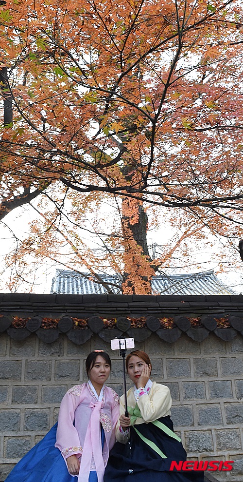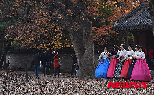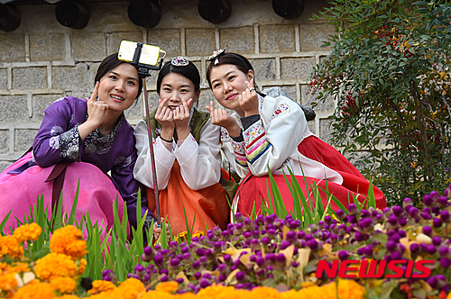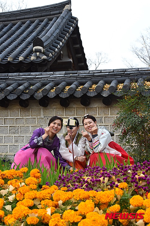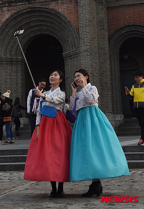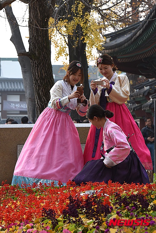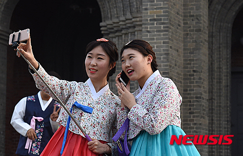 全州市内の全州韓屋マウルで22日午後、市民たちが韓服(韓国の伝統衣装)姿で写真を撮りながら楽しいひとときを過ごした。