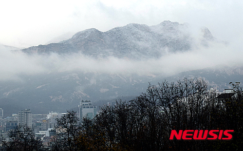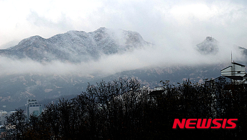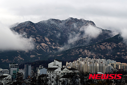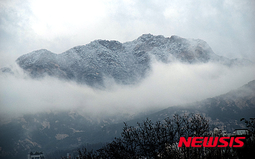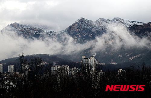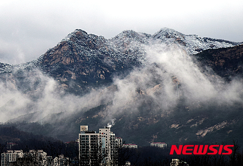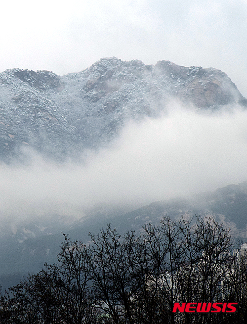 江原道に大雪警報が出された25日午前、ソウル市恩平区の亰郷パークアパートから眺めた北漢山には初雪が積もり、雲海に包まれ、美しい風景を成していた。