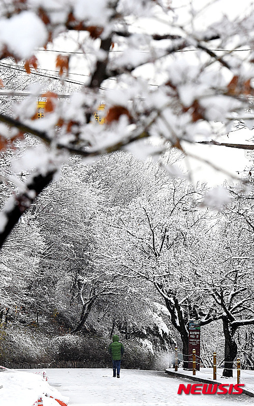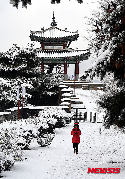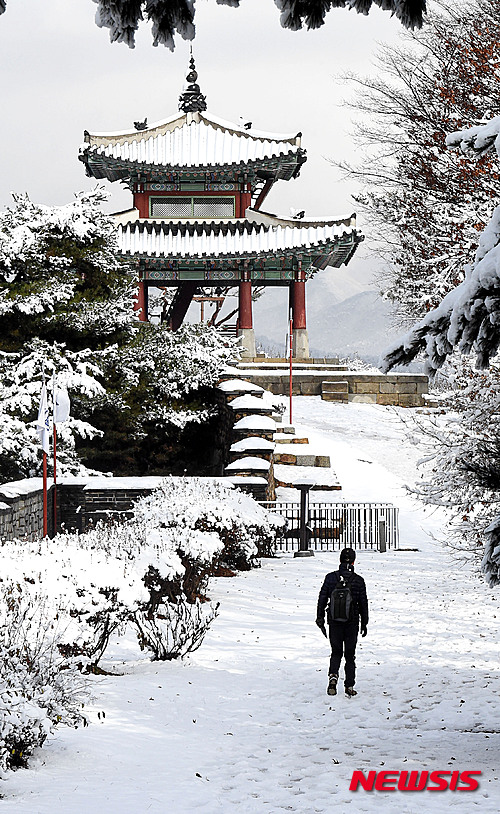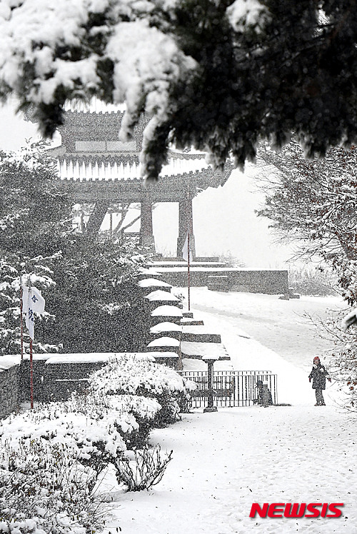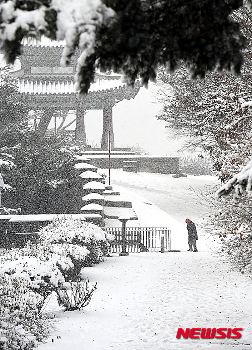 ソウルをはじめ京畿道、慶尚北道、忠清道など全国各地で大雪注意報が発令された3日午前、京畿道水原市八達区の西将台では、雪の中散策をする市民の姿が見られた。