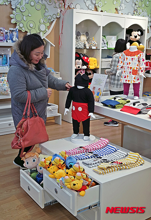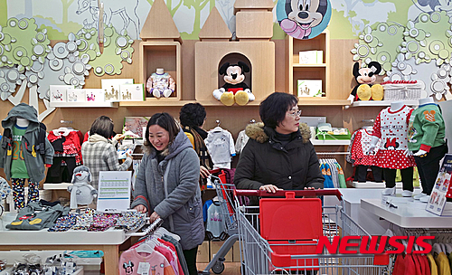 京畿道水原市の大手スーパー「ロッテマート」広橋店で4日、顧客たちがディズニー・ベビー・ショップで買い物をしている。