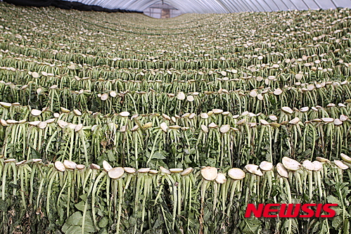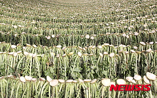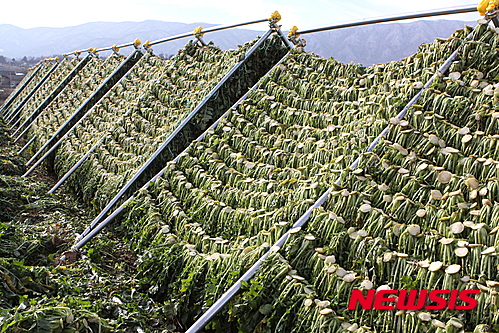 江原道揚口郡亥安面で9日午後、住民たちが、ウェルビーイング食品として注目を集めている干し葉にする大根の葉を乾燥させていた。