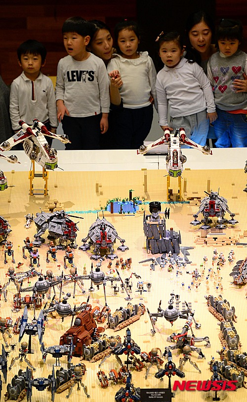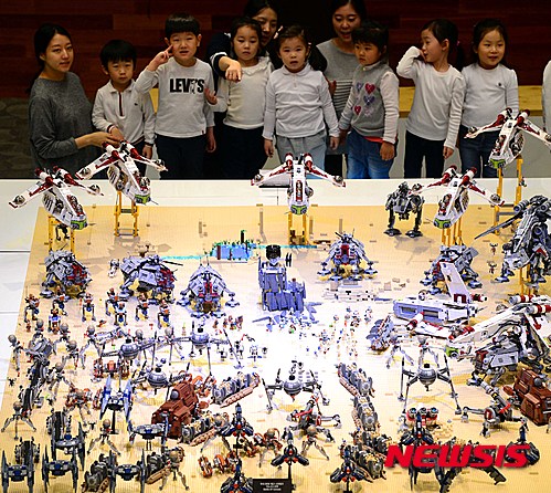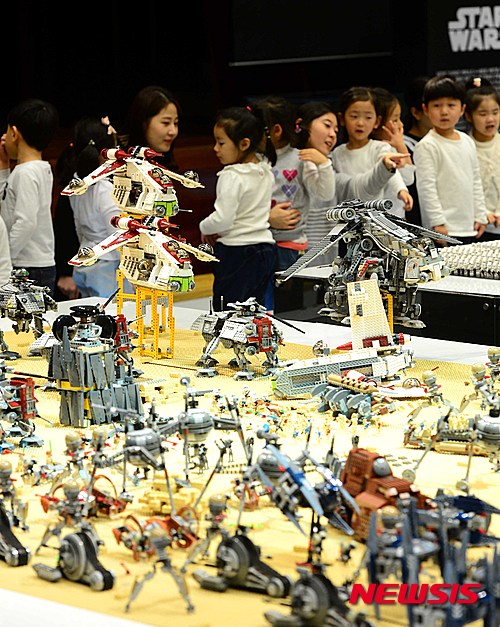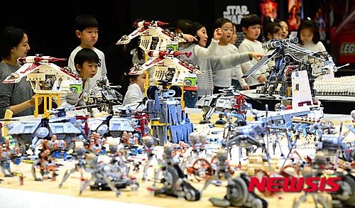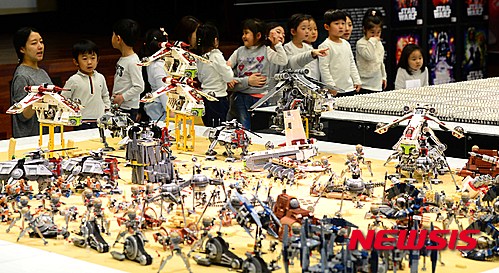 釜山市内の新世界センタムシティー9階文化ホールで11日午前、「スター・ウォーズ・レゴ大展」を訪れた子どもたちが、ブロックでつくられた映画の中の戦闘シーンを眺めながら楽しいひとときを過ごした。