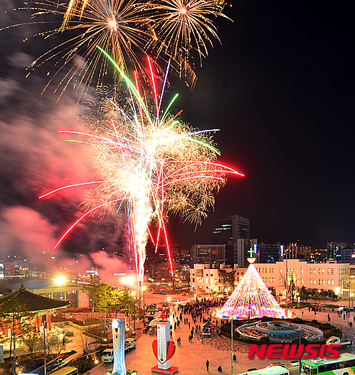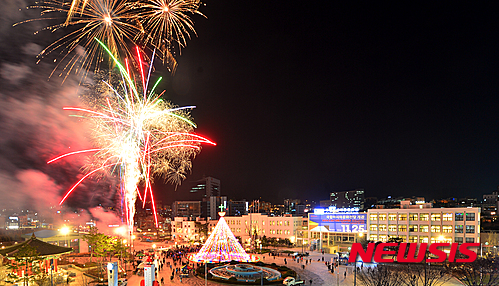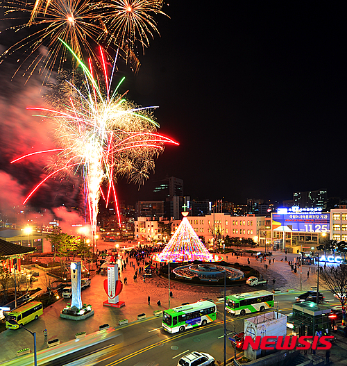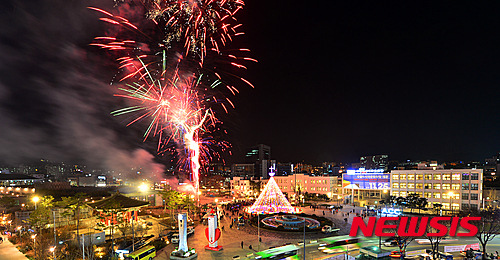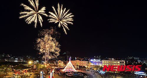 光州市東区にある国立アジア文化の殿堂5・18民主広場で13日午後、クリスマスツリーの点灯式が行われ、ツリーの灯りと色とりどりの打ち上げ花火が夜空を彩った。