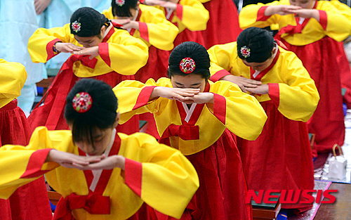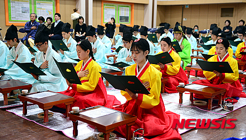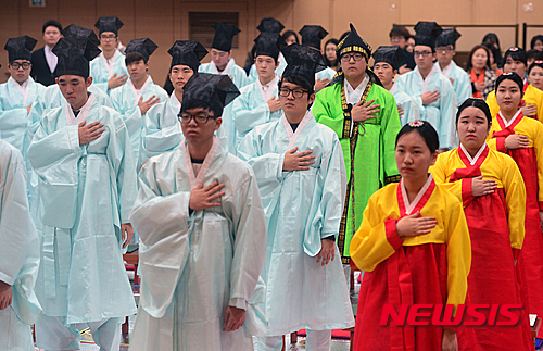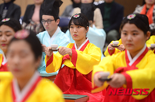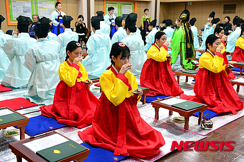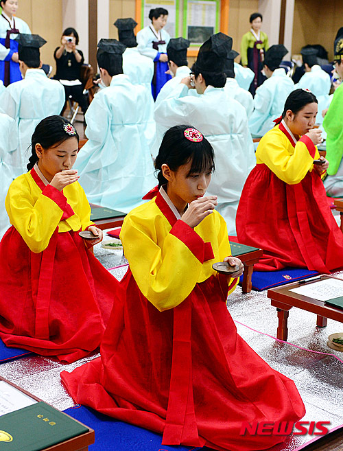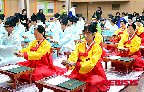 15日午後、ソウル市江北区庁の大講堂で「伝統成年礼(成人儀式)」が行われた。この儀式では先月、大学修学能力試験(修能=日本のセンター試験に相当)を終えたばかりの高校3年生たちが初めて酒を口にした。
