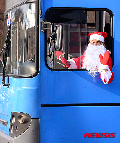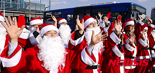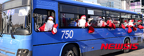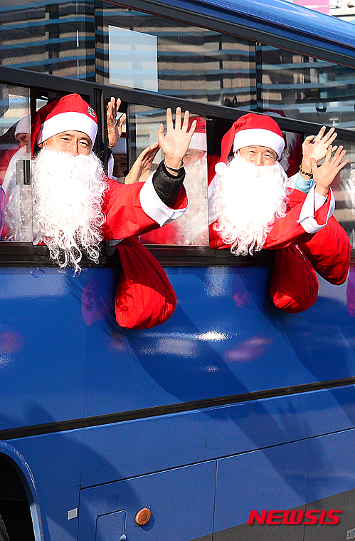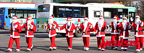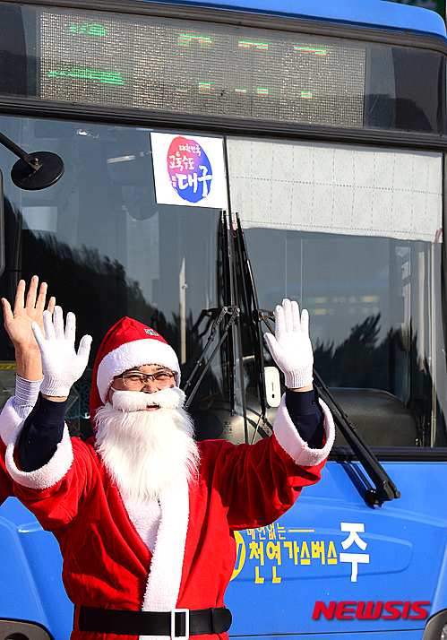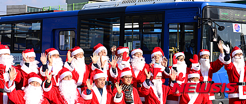 クリスマスを前に、市内バスの運転手たちがサンタクロースに扮(ふん)して大邱市内を走ることになった。写真は21日午後、大邱市北区のバス会社車庫で行われた出発式の様子。サンタの運転手たちが乗客に手を振っている。