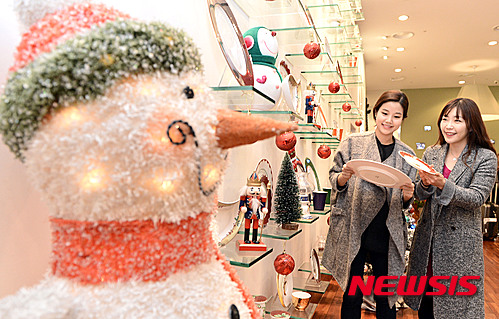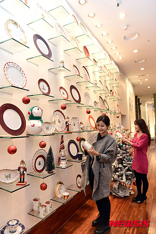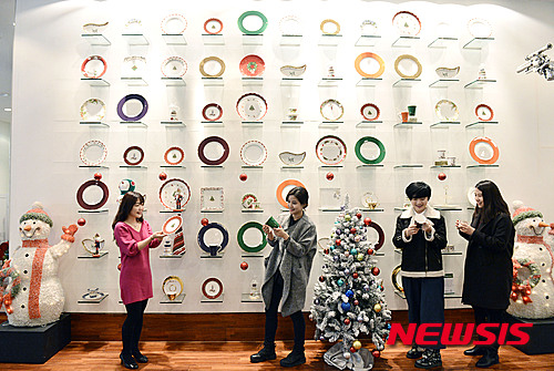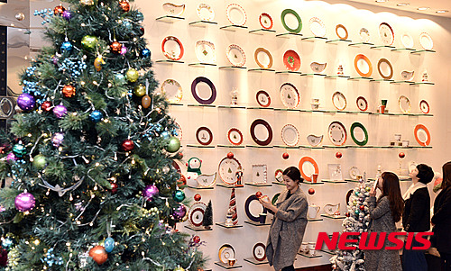 23日、クリスマスに合わせてIPブティックホテル(ソウル市竜山区漢南洞)のロビー壁面が韓国陶磁器で飾られ、訪れた市民の注目を集めた。