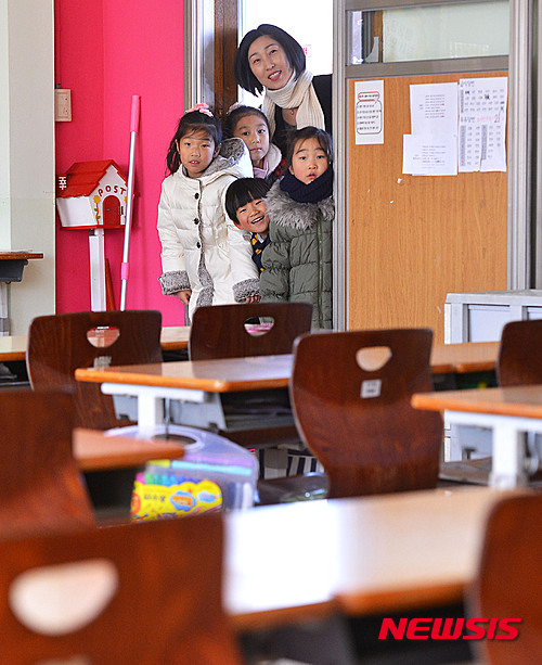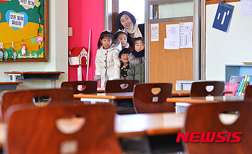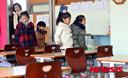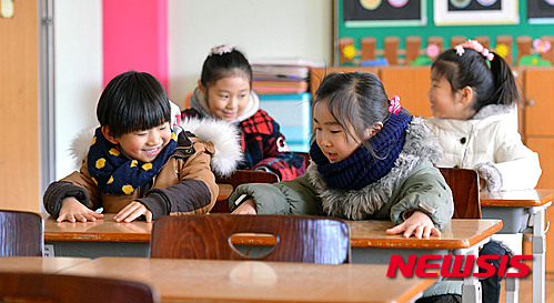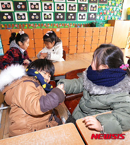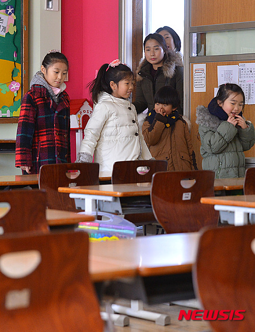 28日午後、京畿道水原市内の仁渓小学校で、韓国の長い冬休み期間中の登校日に教室にやって来た子どもたち。
