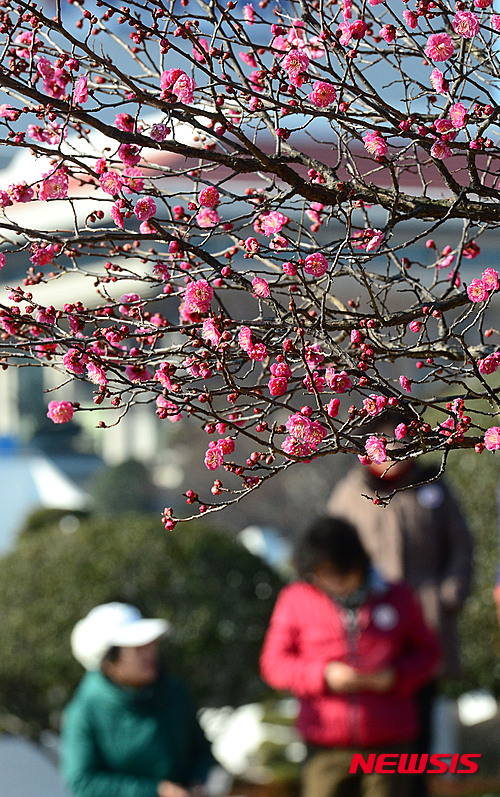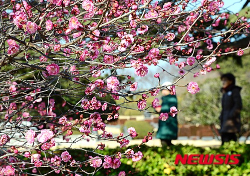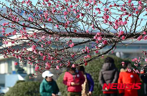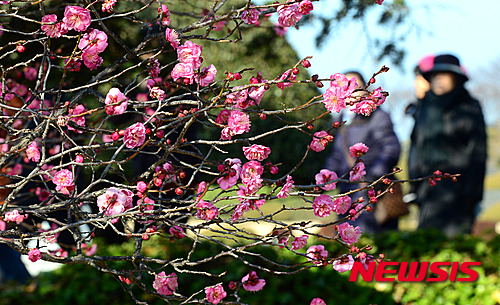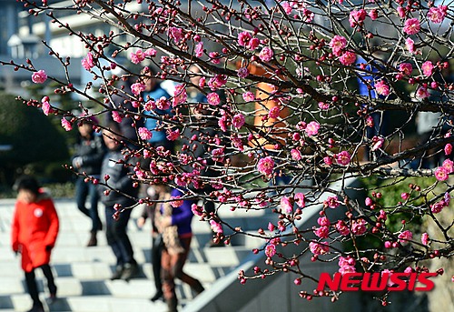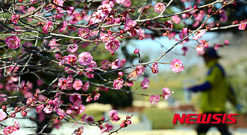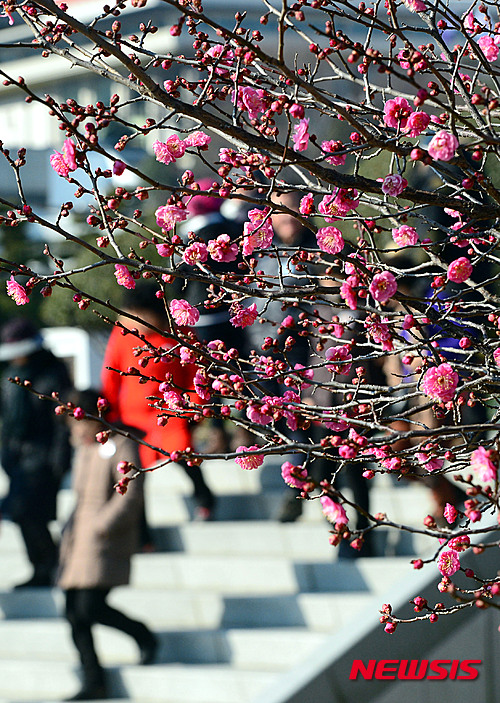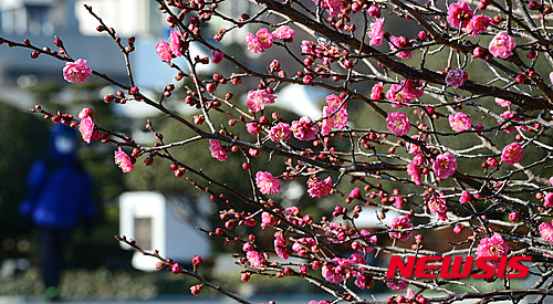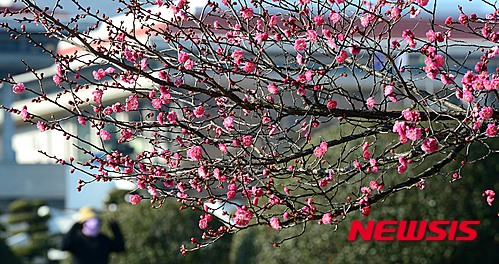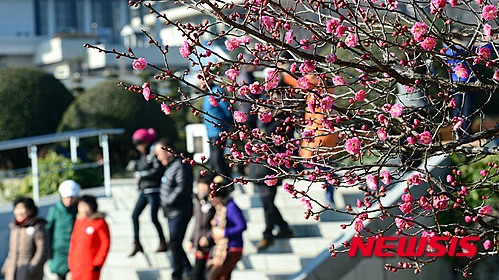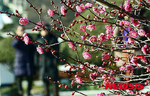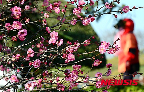 7日午前、国連記念公園(釜山市南区)を訪れた市民が、花開き始めた「春の伝道師」こと紅梅を見物した。