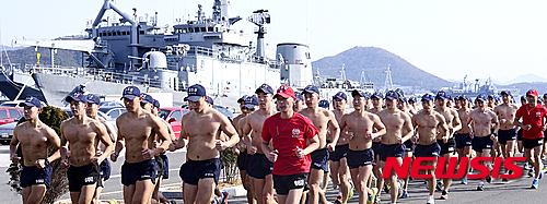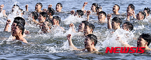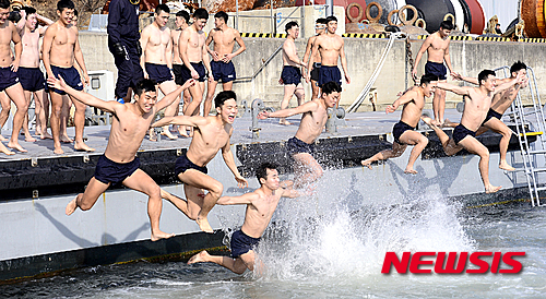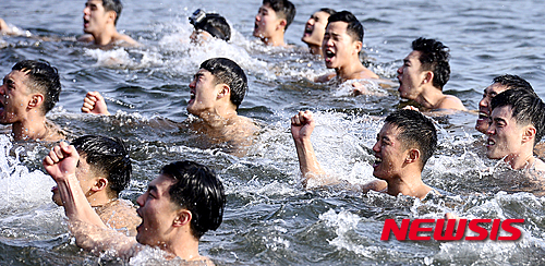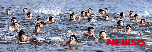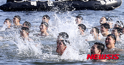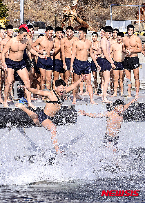 北朝鮮による4回目の核実験以降、さらなる挑発の可能性が持ち上がる中、慶尚南道昌原の鎮海軍港で韓国海軍水難救助隊(SSU)の酷寒期訓練が行われた。写真は11日午後、ウエットスーツなしで泳ぐため海に飛び込むSSU隊員。