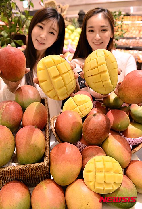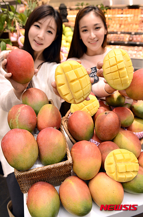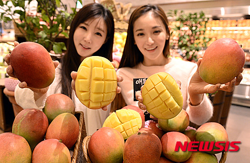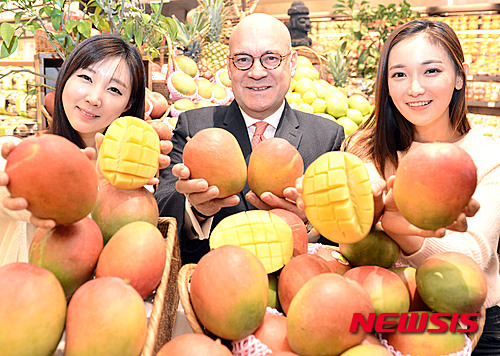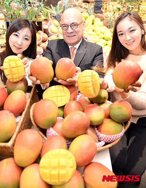 11日午前、ソウル市中区の新世界デパート本店で、韓国で初めて販売されるペルー産アップルマンゴーのPRイベントが行われた。