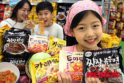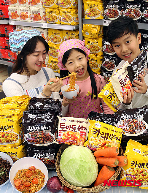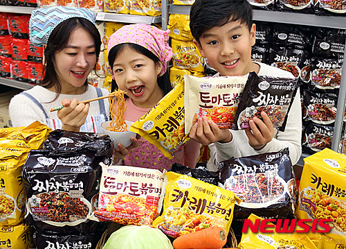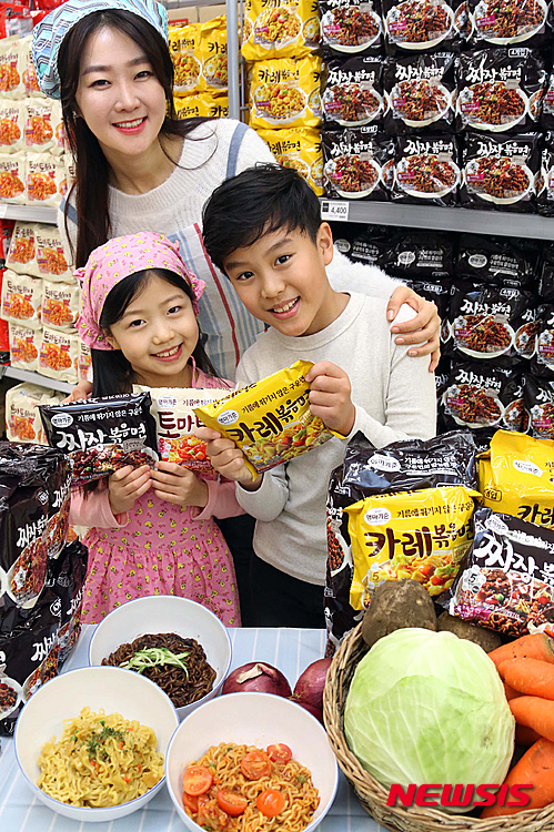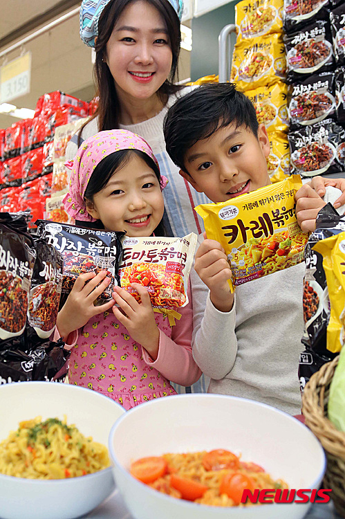 ソウル市漢江路のEマート竜山店で12日、PEACOOK「母親基準」シリーズのポックム麺ジャージャー風、カレー風、トマト風の販促イベントが行われた。