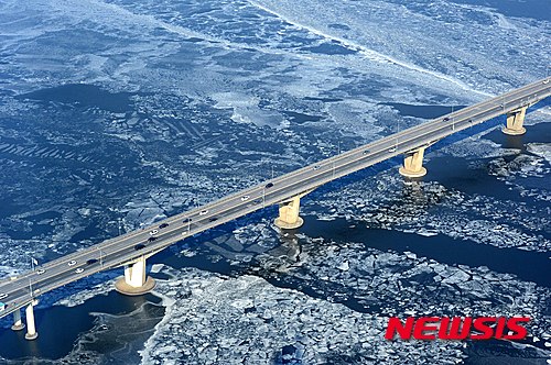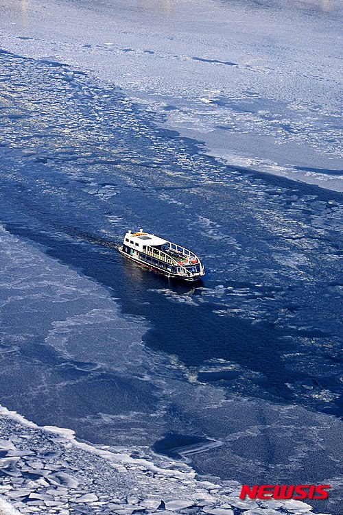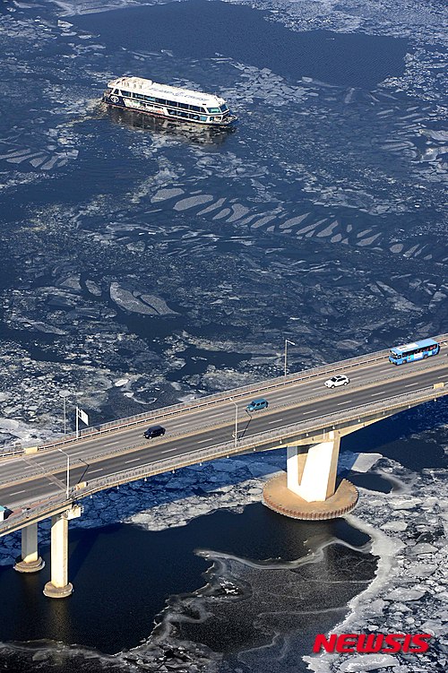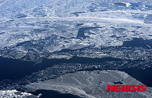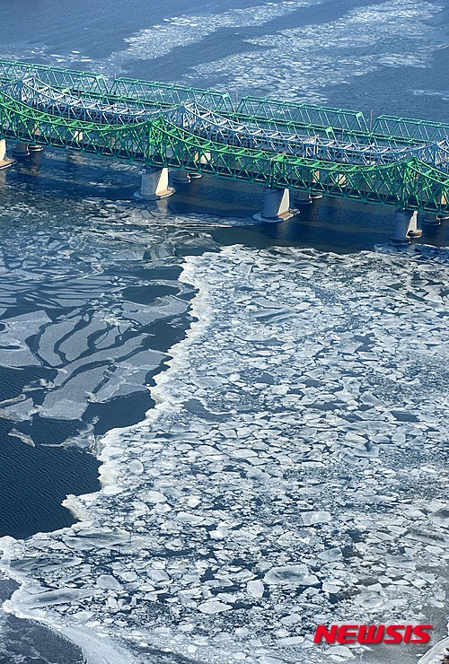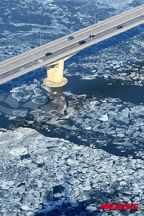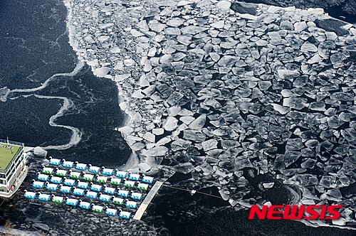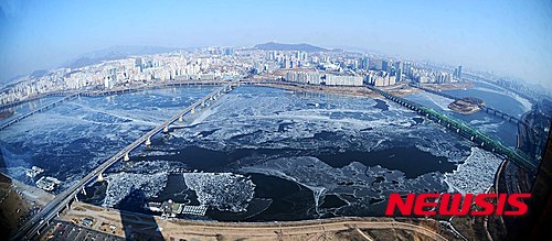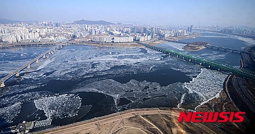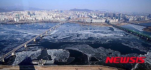 ソウル市内の朝の気温が氷点下18℃まで下がるなど、厳しい寒さが続く24日、同市永登浦区汝矣島の超高層ビル「63スクエア」から眺めた漢江は氷の塊で覆われていた。