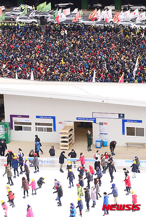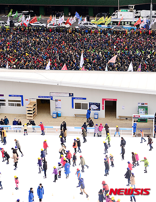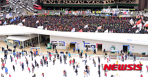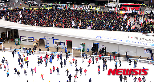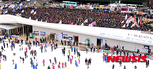 30日午後、ソウル市庁前の広場では、全国民主労働組合総連盟(民主労総)のゼネスト勝利全国労働者大会が開かれる一方、市民がスケートリンクで週末を楽しんだ。