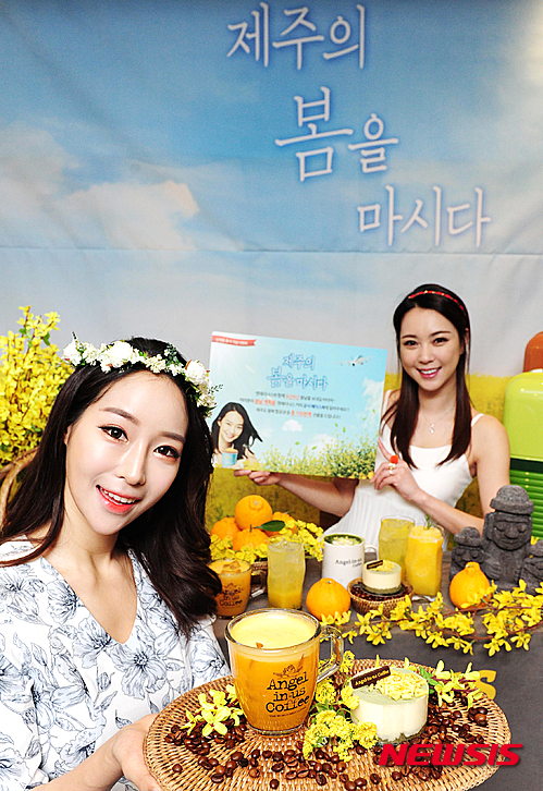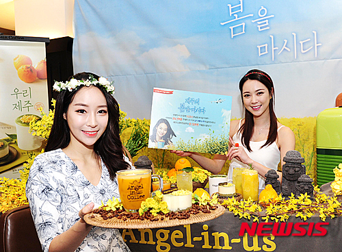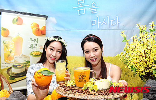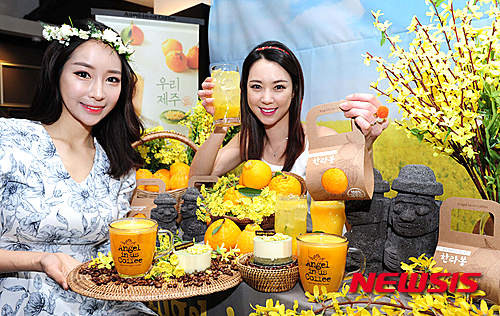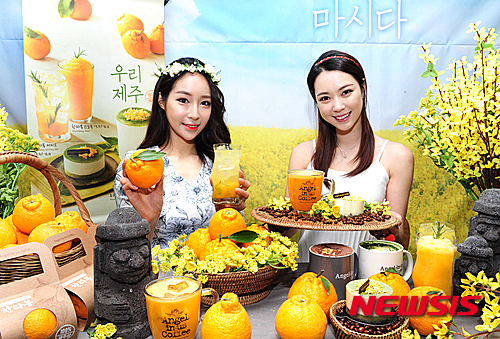 ソウル市鍾路区のAngel-in-us Coffee光化門店で4日、済州特産の農産物を活用した新製品「漢拏峰スノー」のPRイベントが行われた。
