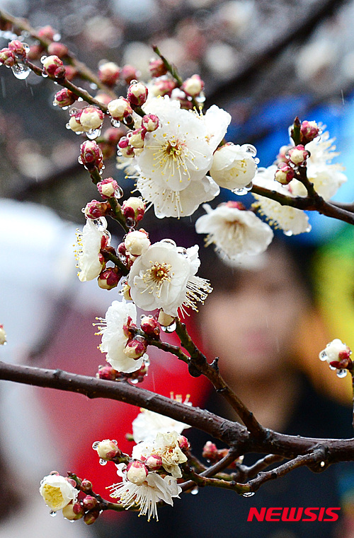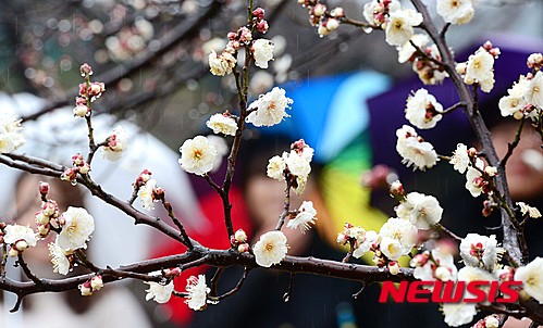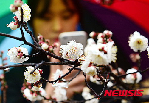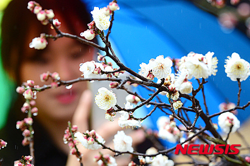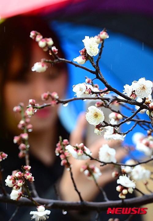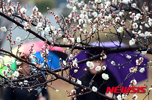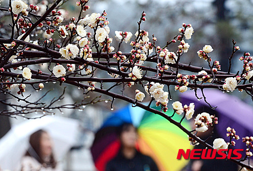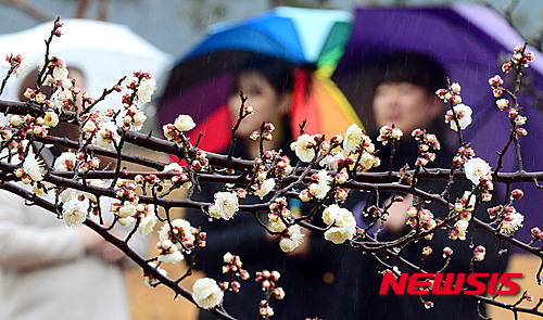 春の訪れを催促する雨が降った12日午後、釜山市南区の東明大学では、つぼみがほころび始めた梅を学生たちが眺めていた。