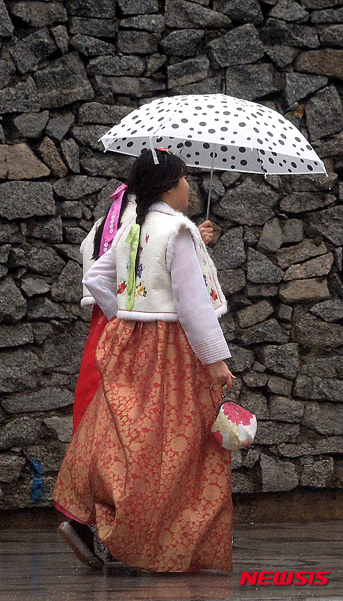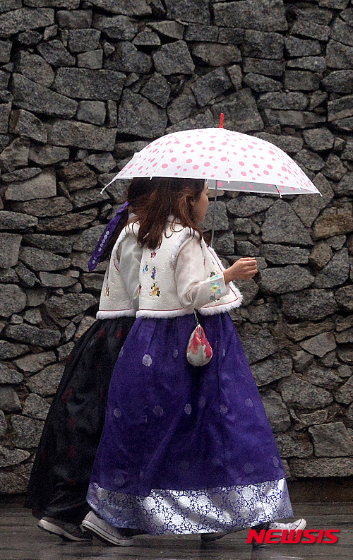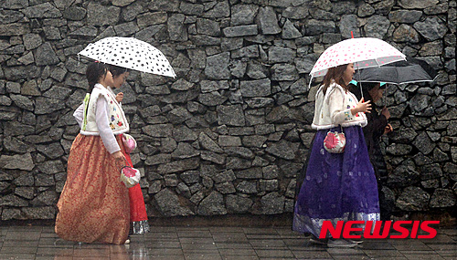 韓国各地で雨天になった13日午後、ソウル市鍾路区の地下鉄3号線安国駅近くでは、雨の中、市民が道を急いでいた。