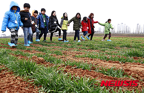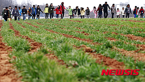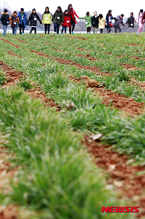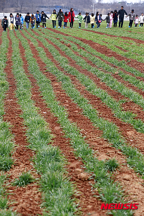 雪が溶けて雨や水になるという二十四節気の一つ「雨水」だった19日午後、全羅北道完州郡の農村振興庁国立食糧科学院にある麦畑では、遠足に来た子どもたちが麦の成長を促す麦踏みをした。