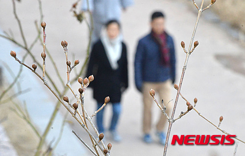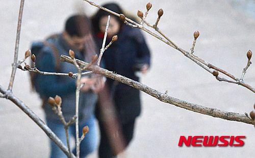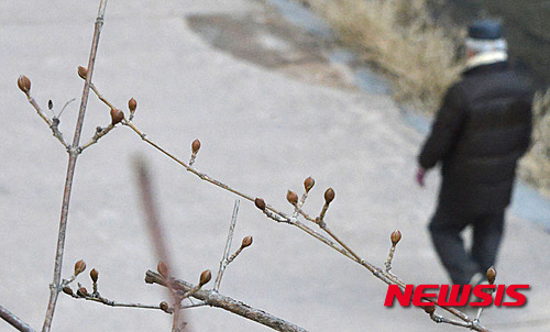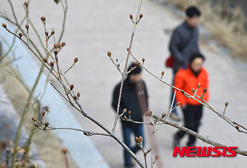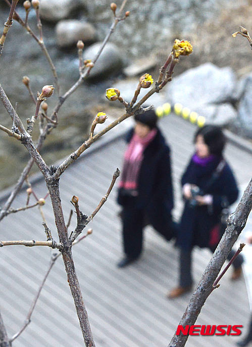 ソウルの最高気温が7度を記録し、暖かな一日となった20日午後、ソウル市中区の清渓川では、サンシュユのつぼみが膨らんでいた。