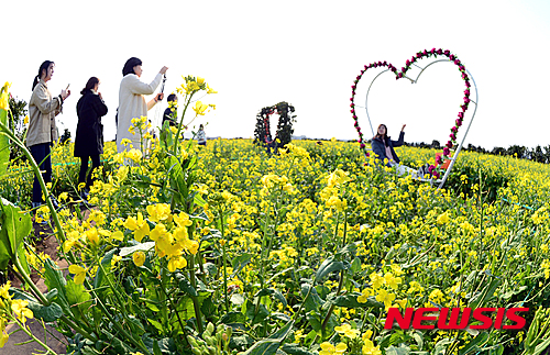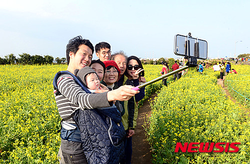 28日午後、済州島の城山日出峰近くにある菜の花畑で、旅行中の家族連れが自撮り棒を使って記念撮影していた。