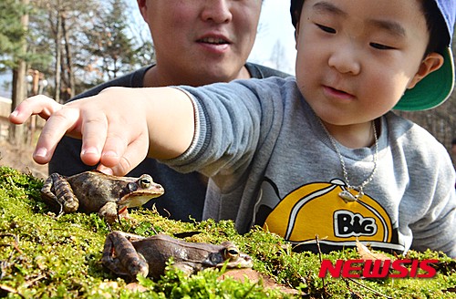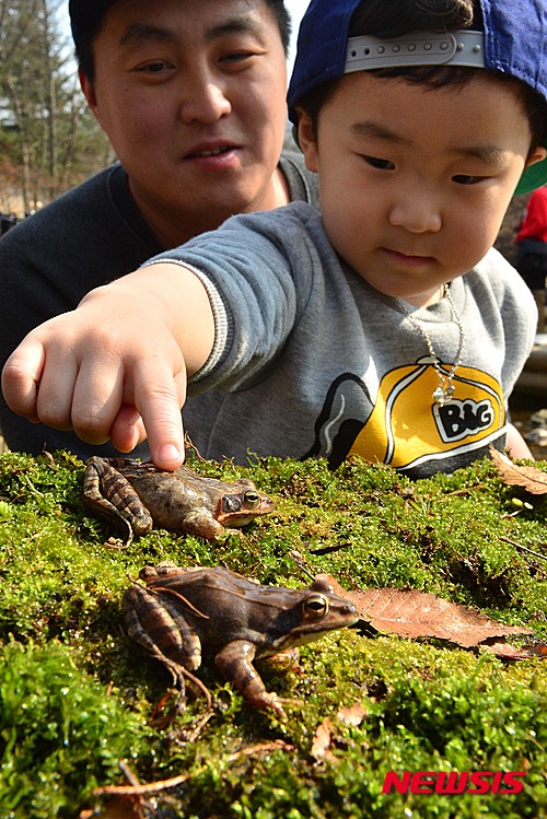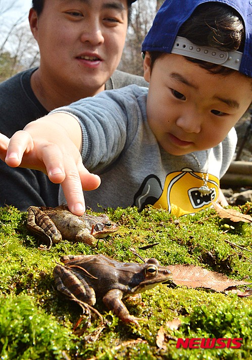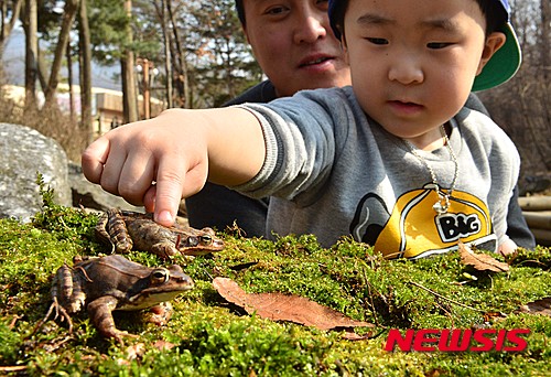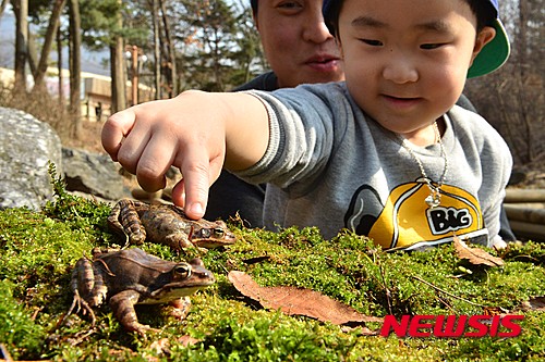 冬眠していた動物が目を覚ます「啓蟄(けいちつ)」が明日に迫った4日午後、ソウル大公園(京畿道果川市)では、公園内の川岸を訪れた子どもが、チョウセンヤマアカガエルなどカエルたちにあいさつをしていた。