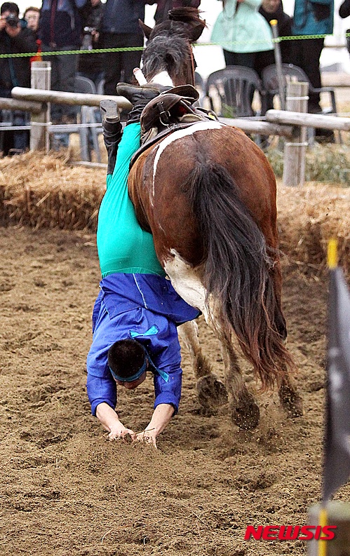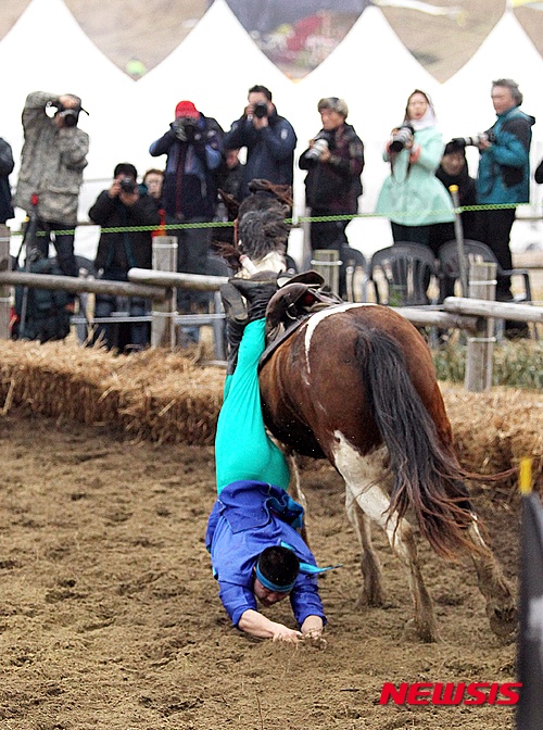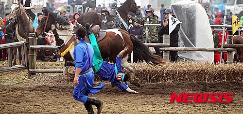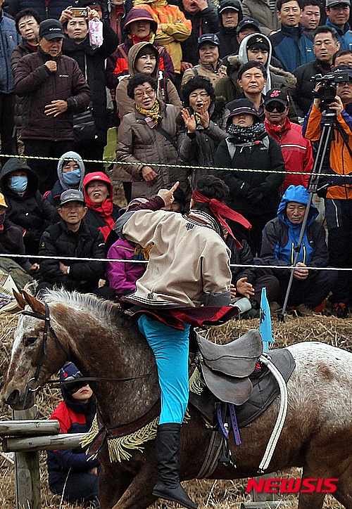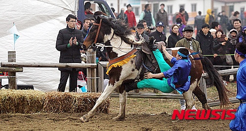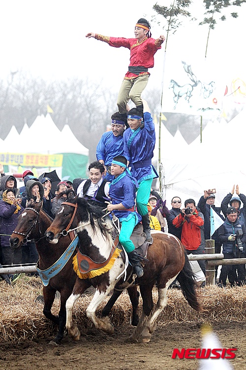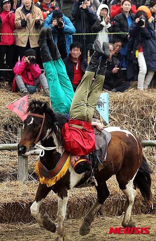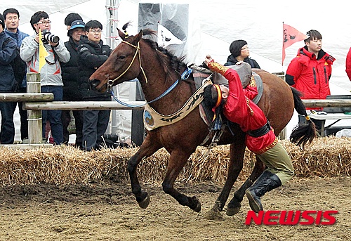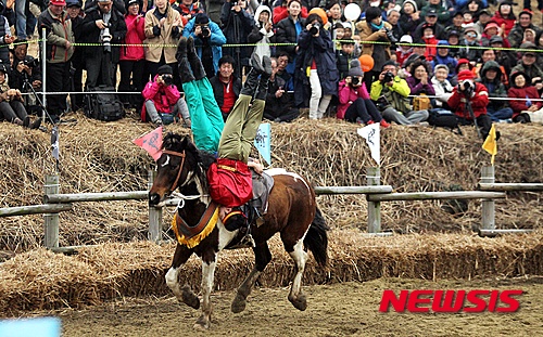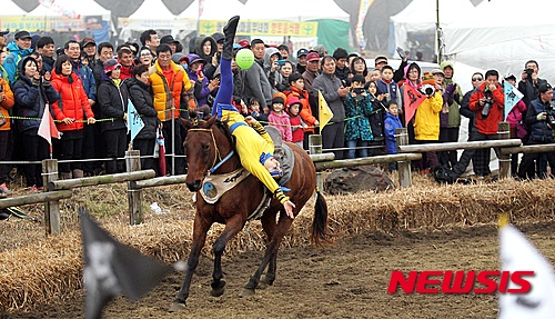 済州市涯月邑鳳城里の暁星岳で5日午後、「2016済州野火祭り」が開かれた。写真は、モンゴル出身の騎馬団員が馬上芸の公演を行っているところ。