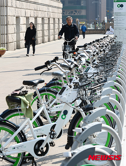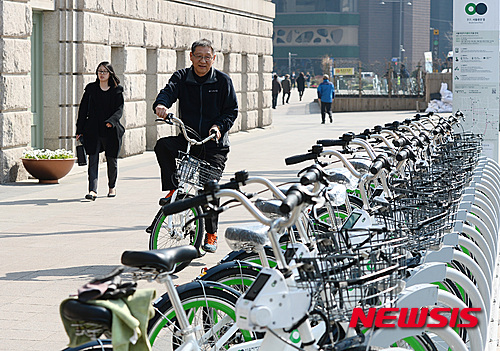 写真は16日、ソウル広場の「タルンイ」貸出所で市民が自転車を利用している様子。