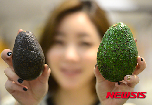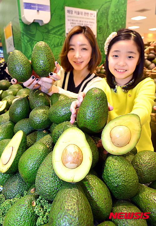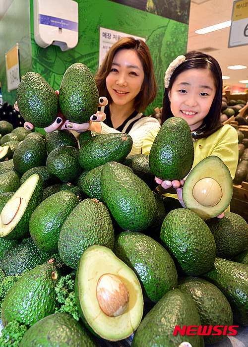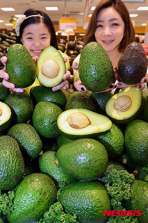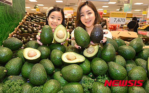 Eマート竜山店(ソウル市竜山区)の農産物売場で16日午前、食べごろのキングアボカドの販促イベントが行われた。従来のアボカドより1.5倍も大きく、価格は1個2490ウォン(約237円)。