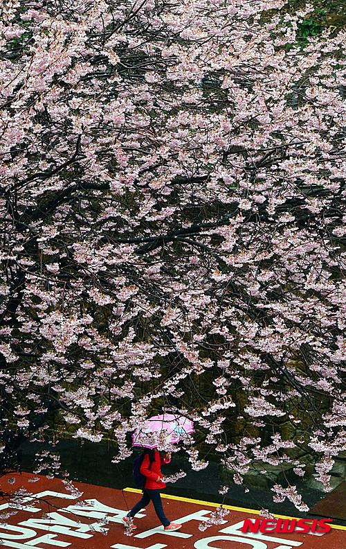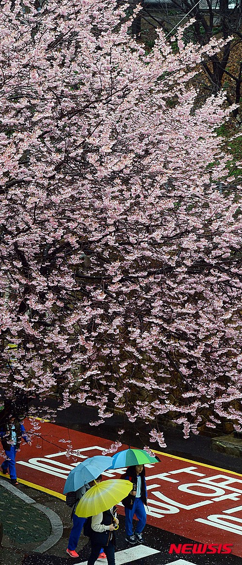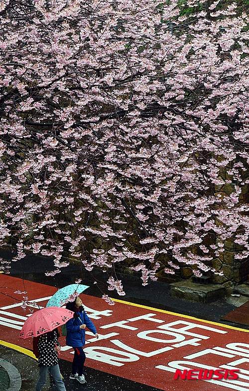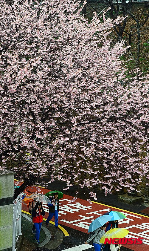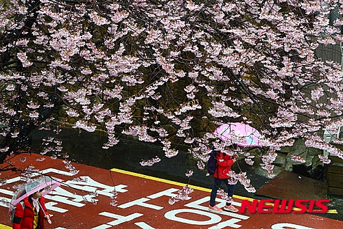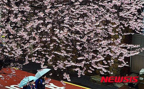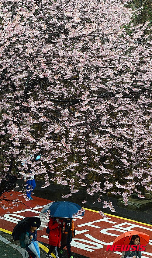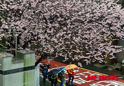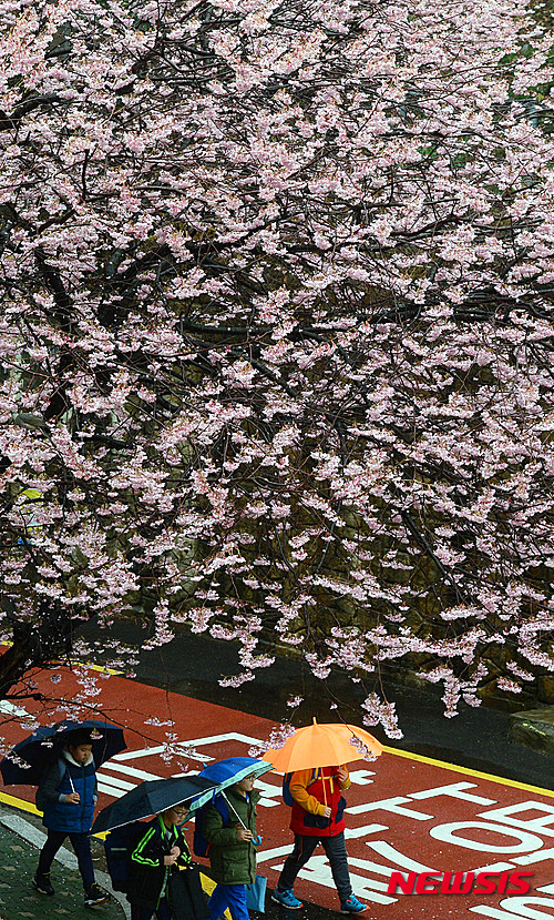 春雨の降る天気となった18日午後、釜山市水営区の培花学校前では、満開のサクラの下、近所の学校の生徒が傘をさして下校していた。